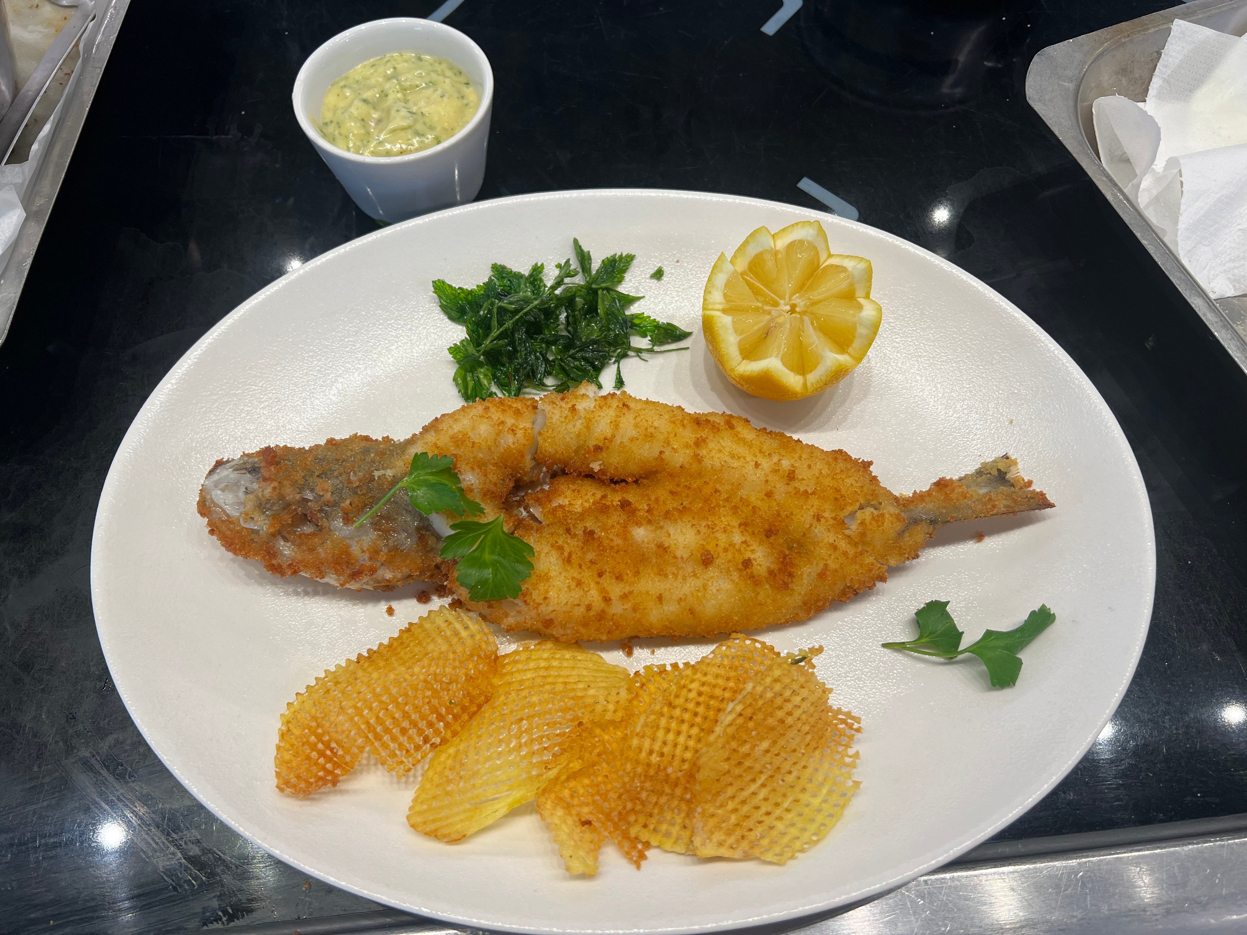 Today was Fried Monday. We made potatoes “gaufrette” (which I am guessing means waffle cut—need to google that) and this fish that looks suspiciously akin to a fried rat; with a side of tartar sauce and fried parsley. It was actually delicious! You never can tell.