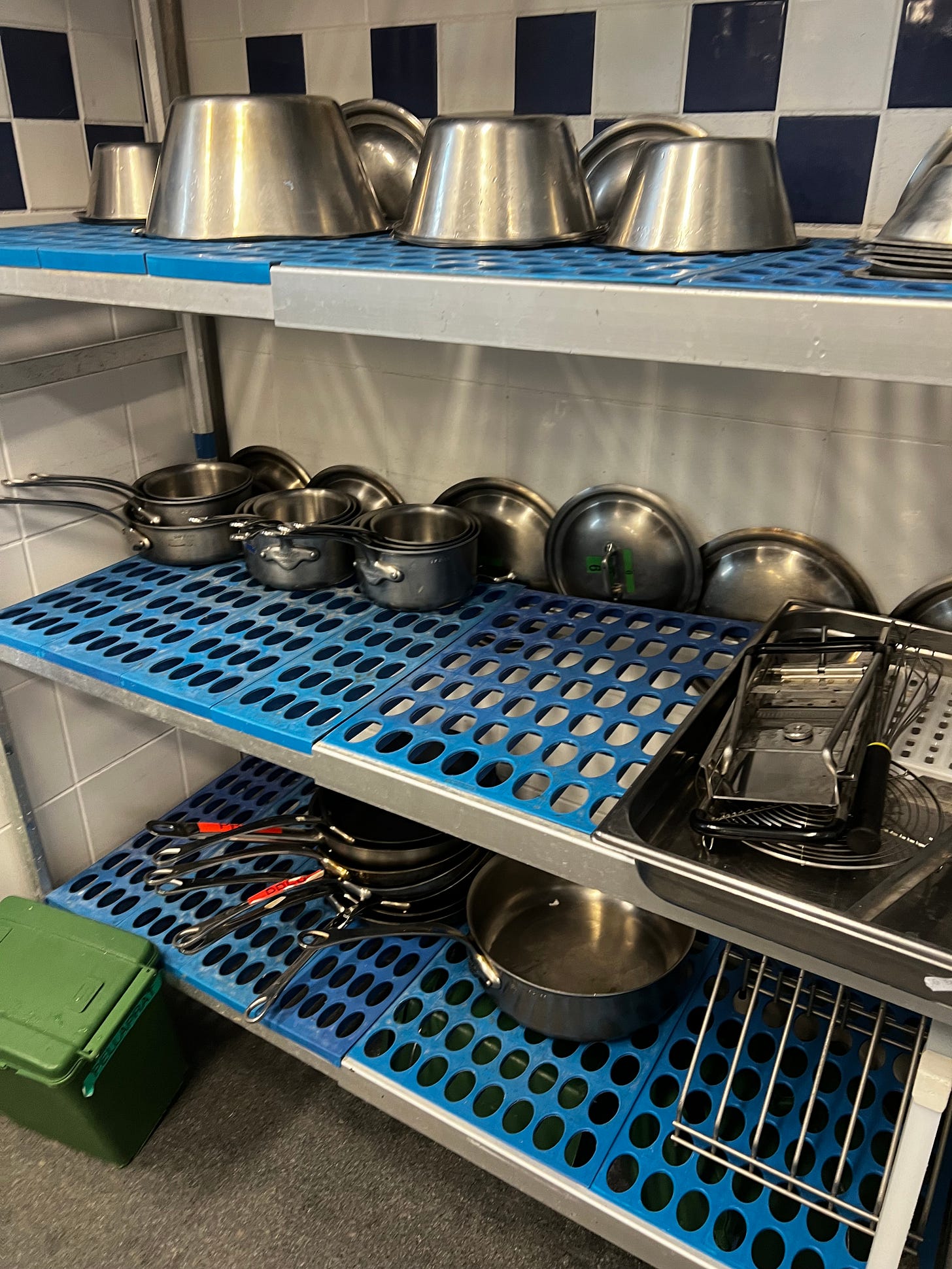 These are where the newly cleaned bowls and pans live—in the dishwashing kitchen.