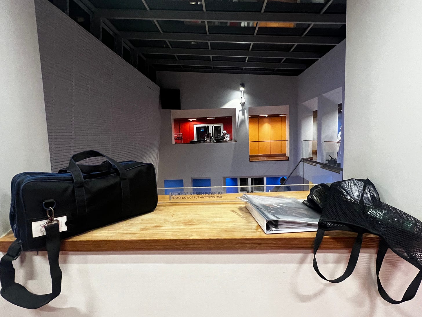 The photo below cracks me up as it completely illustrates the seating issue and the fact that there is nowhere to put anything. Those are my things on that counter top. Please notice the sign that says, “PLEASE DO NOT PUT ANYTHING HERE.” Seriously, like nobody is going to dump their gear for a hot minute while they regroup? Of course, everyone ignores it and puts their knife kits up there so they can —you know—look inside them. Instead of laying them on the floor. You can’t tell from this innocent photo how much that thing weighs but I am here to tell you I have some serious biceps these days. Them people be crazy.