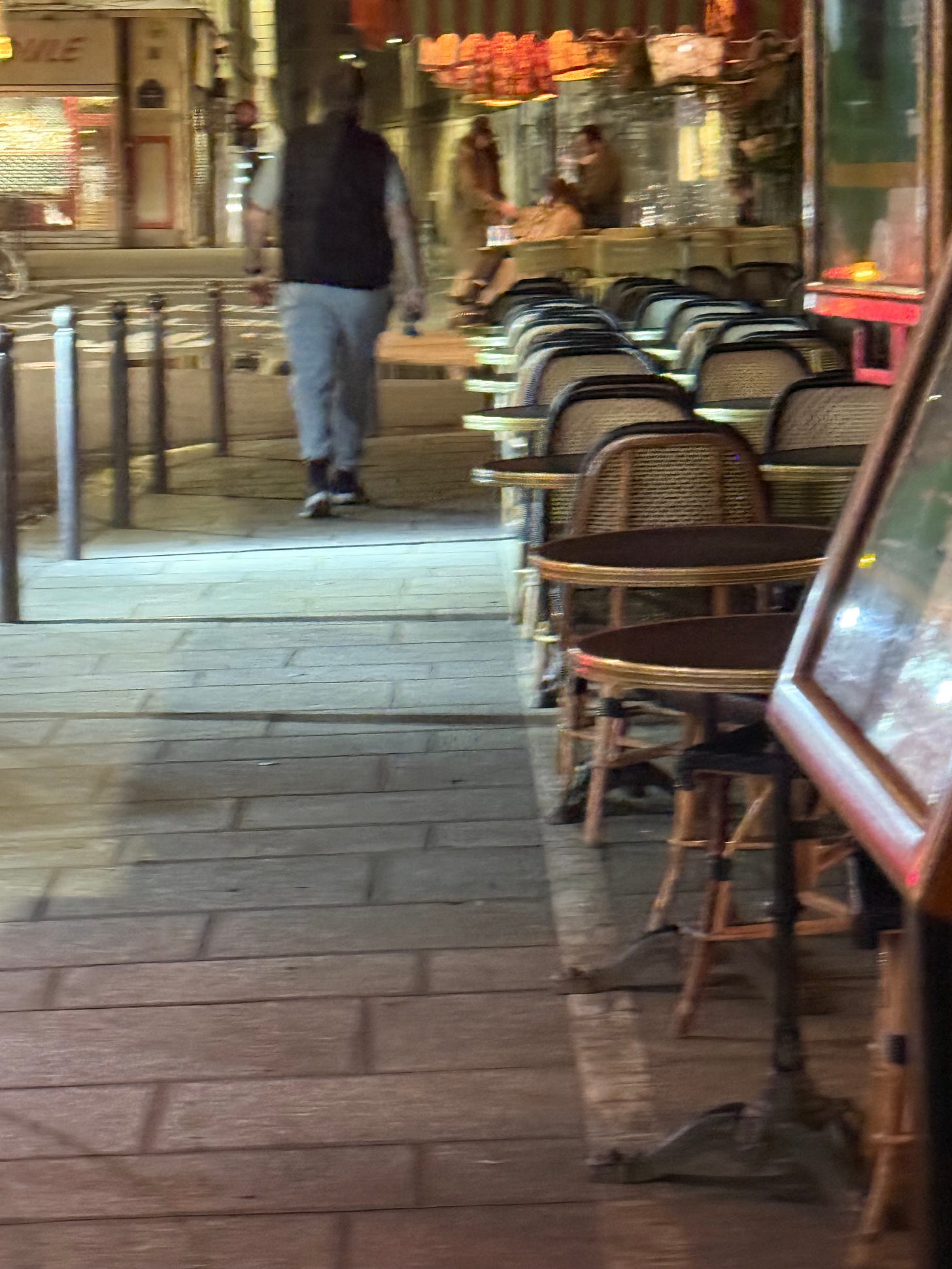 The funniest scene I have seen (pun intended) was the other day at 6:30am when I was walking to the metro for class, and as I turned the corner onto rue de Buci which is lined with cafes—not nightclubs—just cafes—that probably close around 11 or 12, there, at a table, were two model types and a man—maybe a photographer or boyfriend, all sitting at an outdoor cafe table with drinks still in front of them, smoking cigarettes. God bless the young! How they were still out when no one but me and the trash men were on the street is amazing! I wanted to take a picture but it seemed too invasive, so I have this rather blurry one from a discreet distance down the street, which doesn’t really show you anything. Sorry.