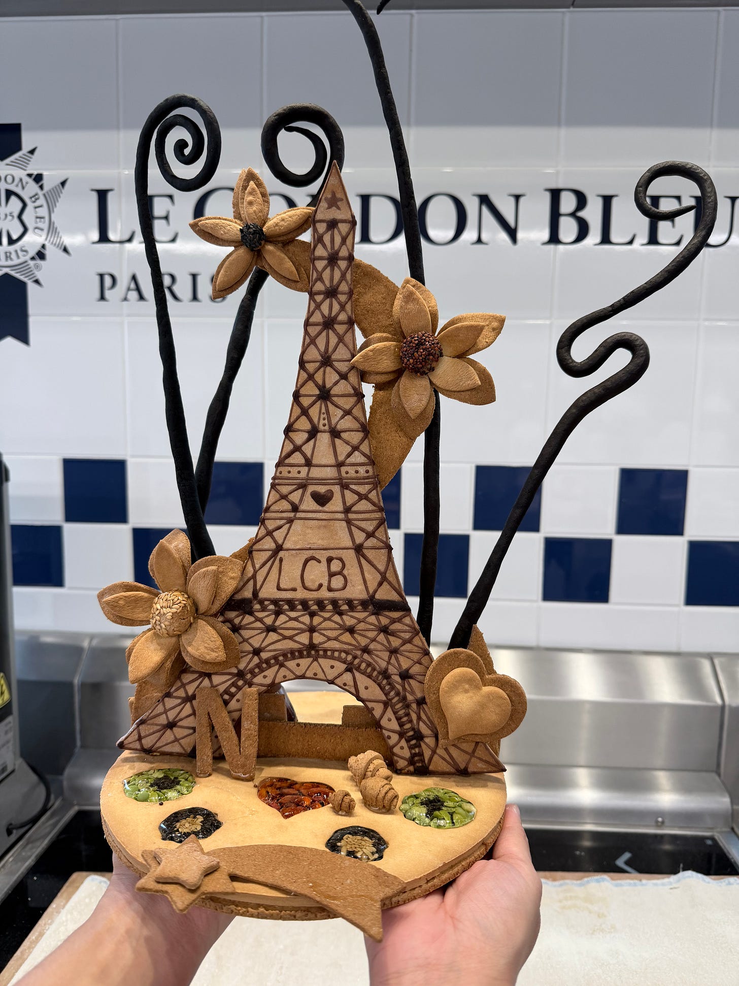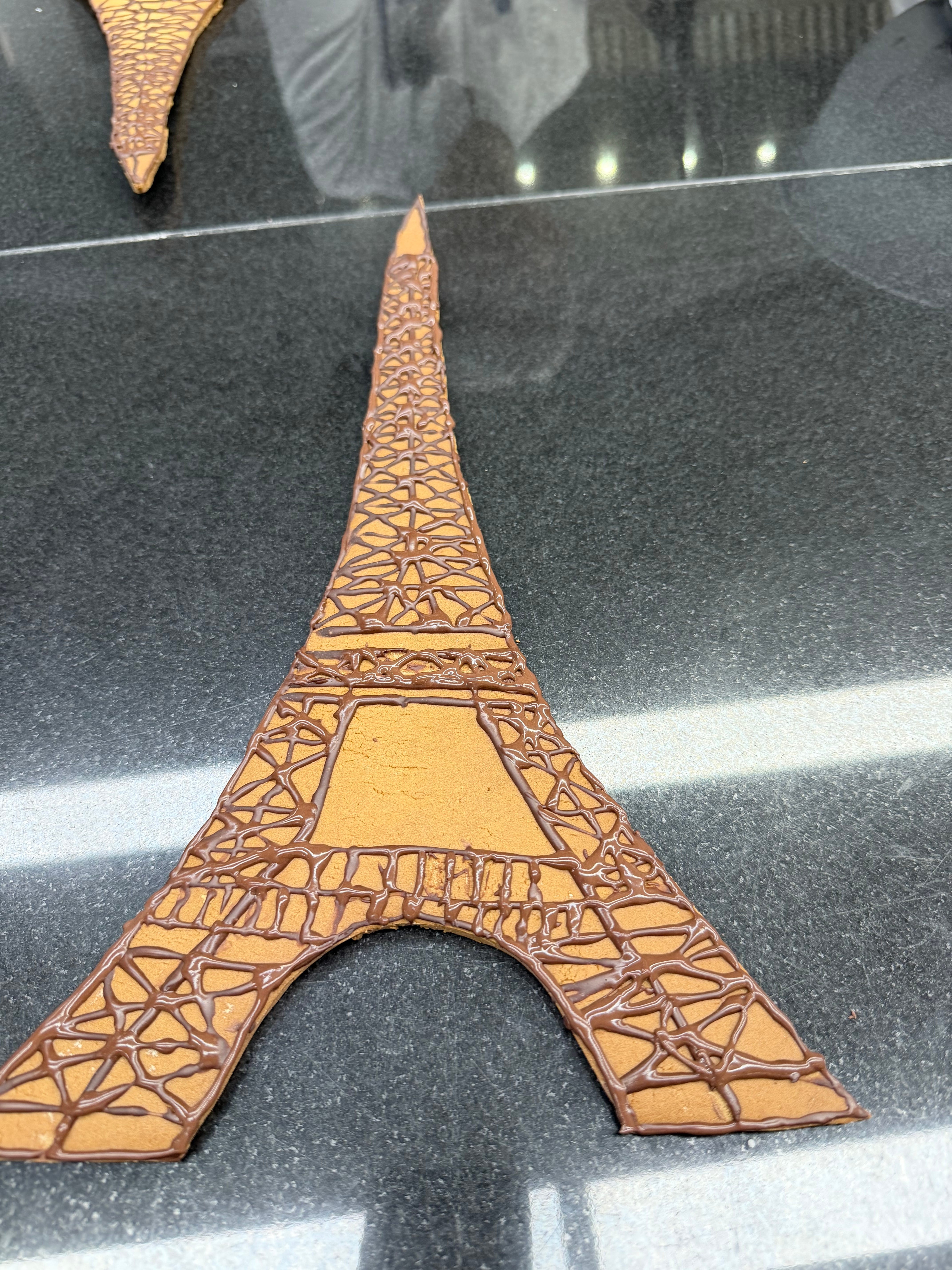 The rest of the week was a lot of review, which in boulangerie translates into croissants and baguettes every day. The only other thing we did, was spend two days making an Eiffel Tower sculpture entirely out of dough. For what reason, you might rightfully ask—and for which I have no rational answer. When will I ever need a sculpture made out of dough? Your child’s birthday party? It truly boggles the mind that dough as art is a component of LCB training. And, oddly, it was not easy. We made the actual tower, some flowers and other decorations out of different types of dough, but the killer was the liquid dough. The liquid dough looks like chocolate sauce and is tough to manipulate. You are not going to believe it from looking at the pictures, but this actually took me 12 hours. Just embarrassing!