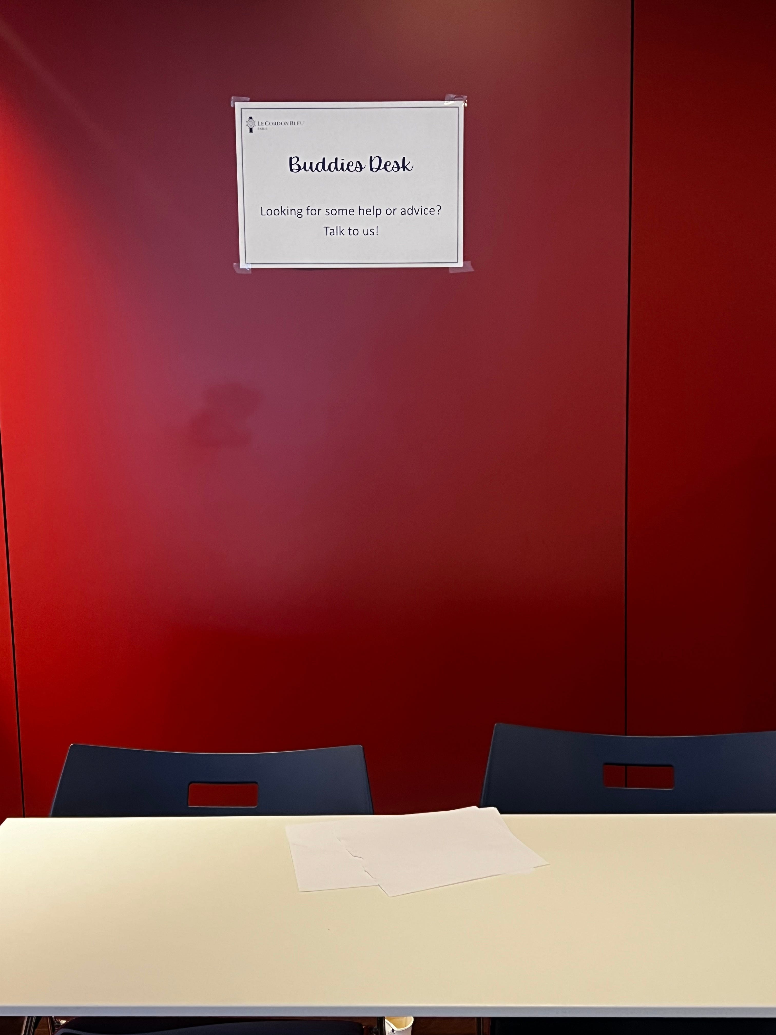 Rid of all those accoutrements I breezed back down the stairs to be greeted with this hilarious sign below—The Buddies Desk—which as you can see has no buddies anywhere in sight. So typically LCB. If I need help I know where not to look.