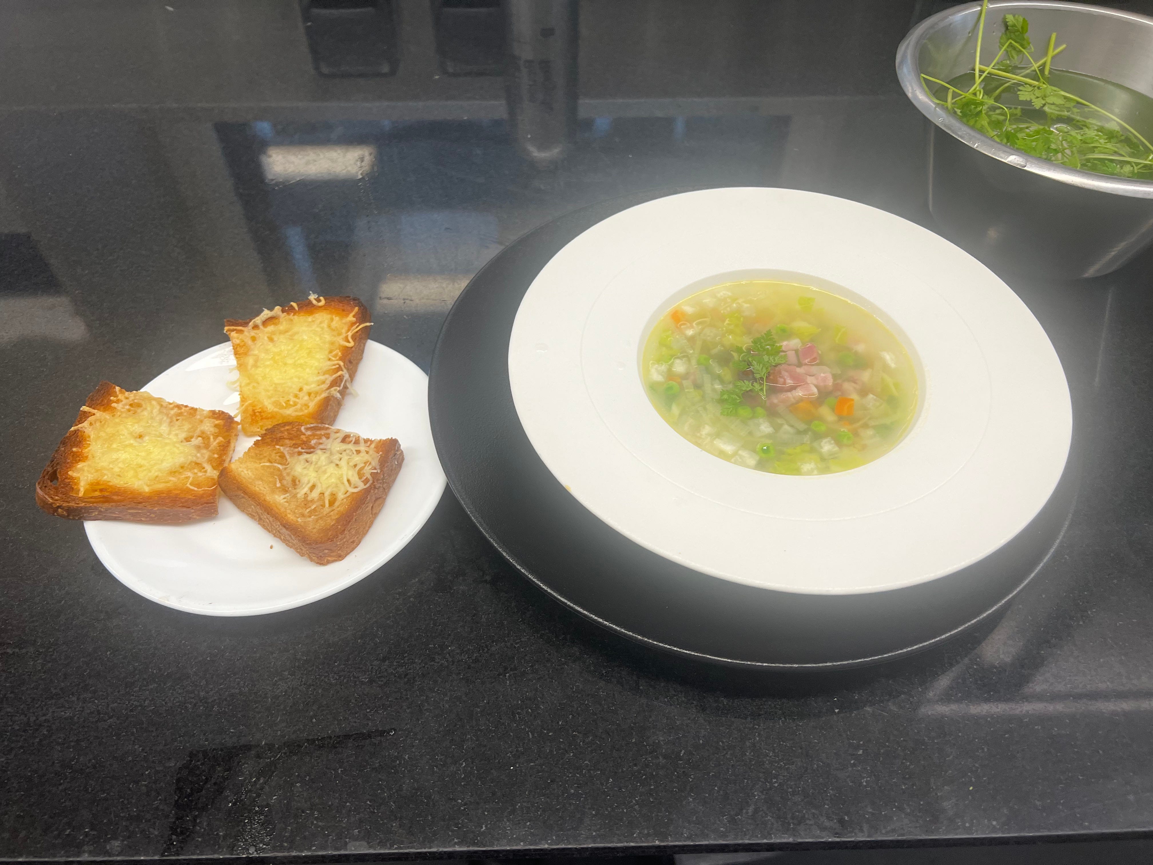 Fast forward to today. I arrived armed with my very well-documented notations at 6:45am. I changed into my uniform, gave myself a pep talk and headed to the kitchen. The potage to be made involved a lot of chopping but I was steady and slightly faster than yesterday and I worked like the Ghost of Christmas Past was rattling chains in my bedroom. Two hours flew by and when Chef said, “ you have twenty minutes left”, I fired up my stovetop, melted my butter, “sweated my vegetables”, added the lardons, skimmed the fat, added the last few ingredients, prepared my croutons and shoved them in the broiler. Then I grabbed the presentation plate and bowl—and voilá—I plated my soup, artfully arranged my croutons and Chef said “bon.” Maybe I got this.