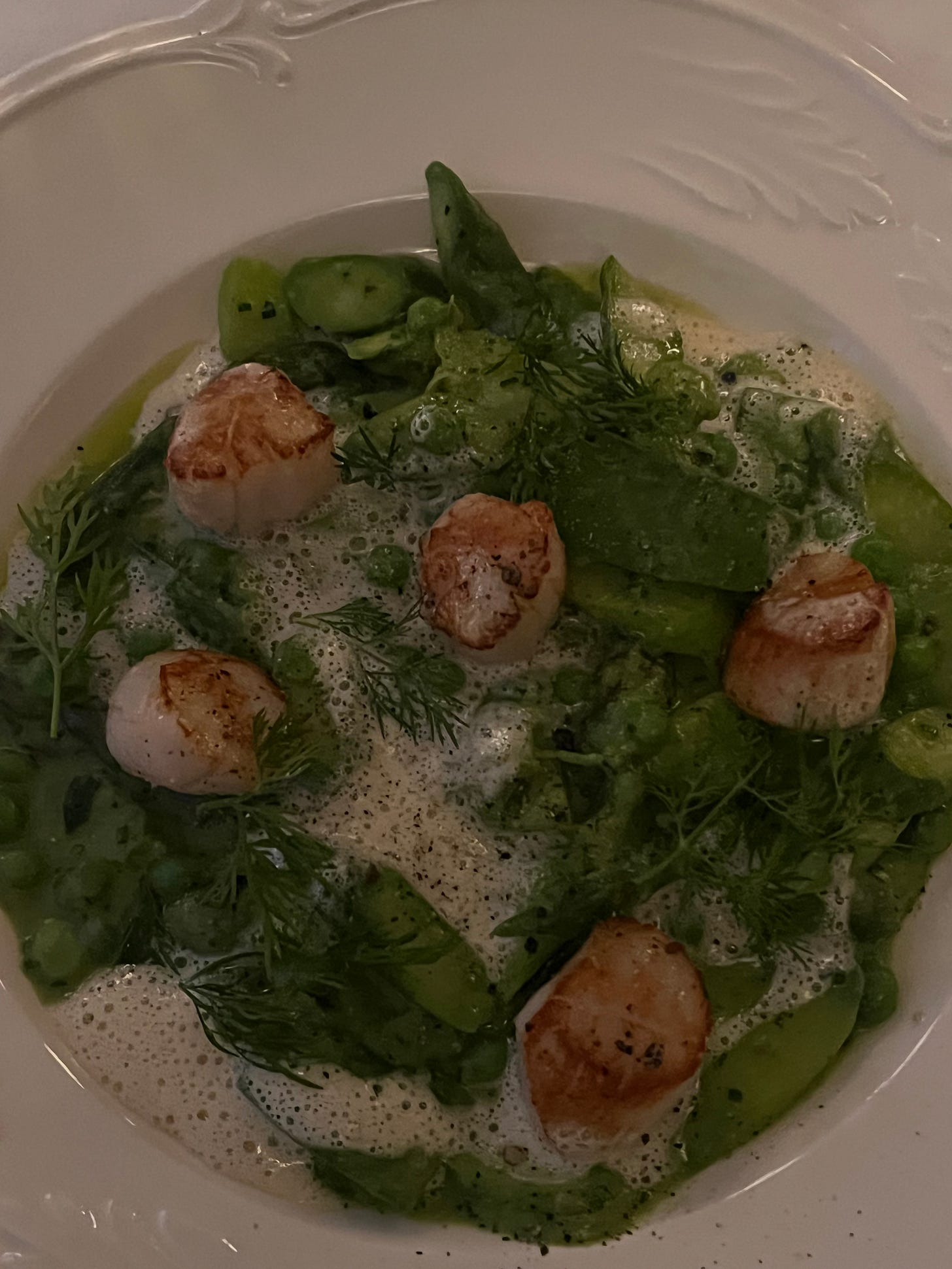 To fortify myself Saturday night, after the second day of home improvement, I met another expat for a fun dinner at Mer et Coquillage. It was a short walk from the apartment and a lovely surprise! The restaurant was beautiful and the food was really great. We both wanted the St. Jacques with spring peas and they were to die for! I almost never order scallops in a restaurant, but I can never resist in France as they are always so fresh and full of flavor. Same for the spring green peas—Just YUM!! Fresh peas are simply delicious and I was thrilled to see them on the menu.