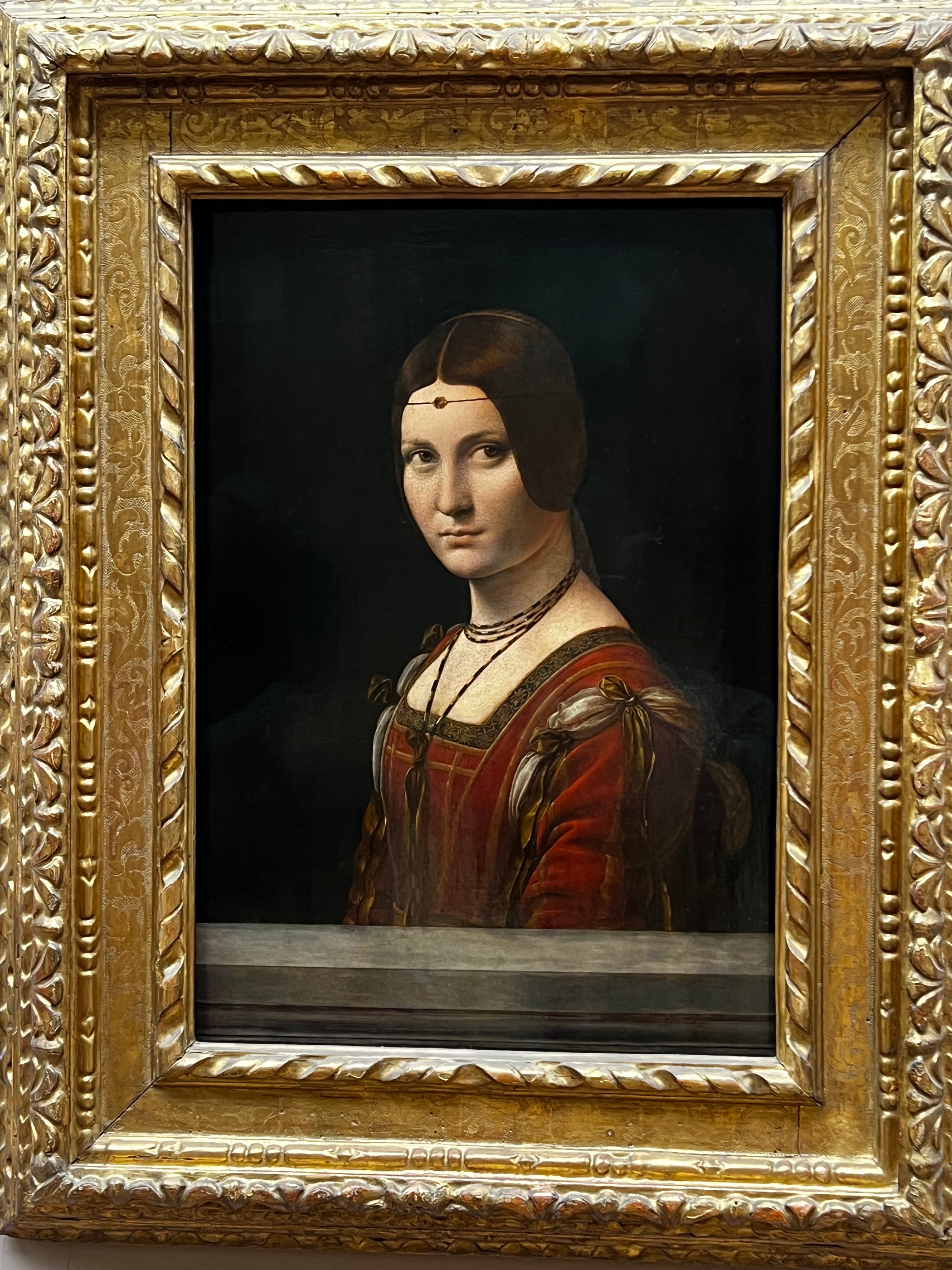 The Wedding Feast is in the same room as the Mona Lisa but the crowd around her was too huge to even think about getting more than a glimpse. And this was a Monday in May—afraid for July! Since I could not even get close to the Mona Lisa I contented myself with viewing another Da Vinci masterpiece—this fine lady. Isn’t she gorgeous!