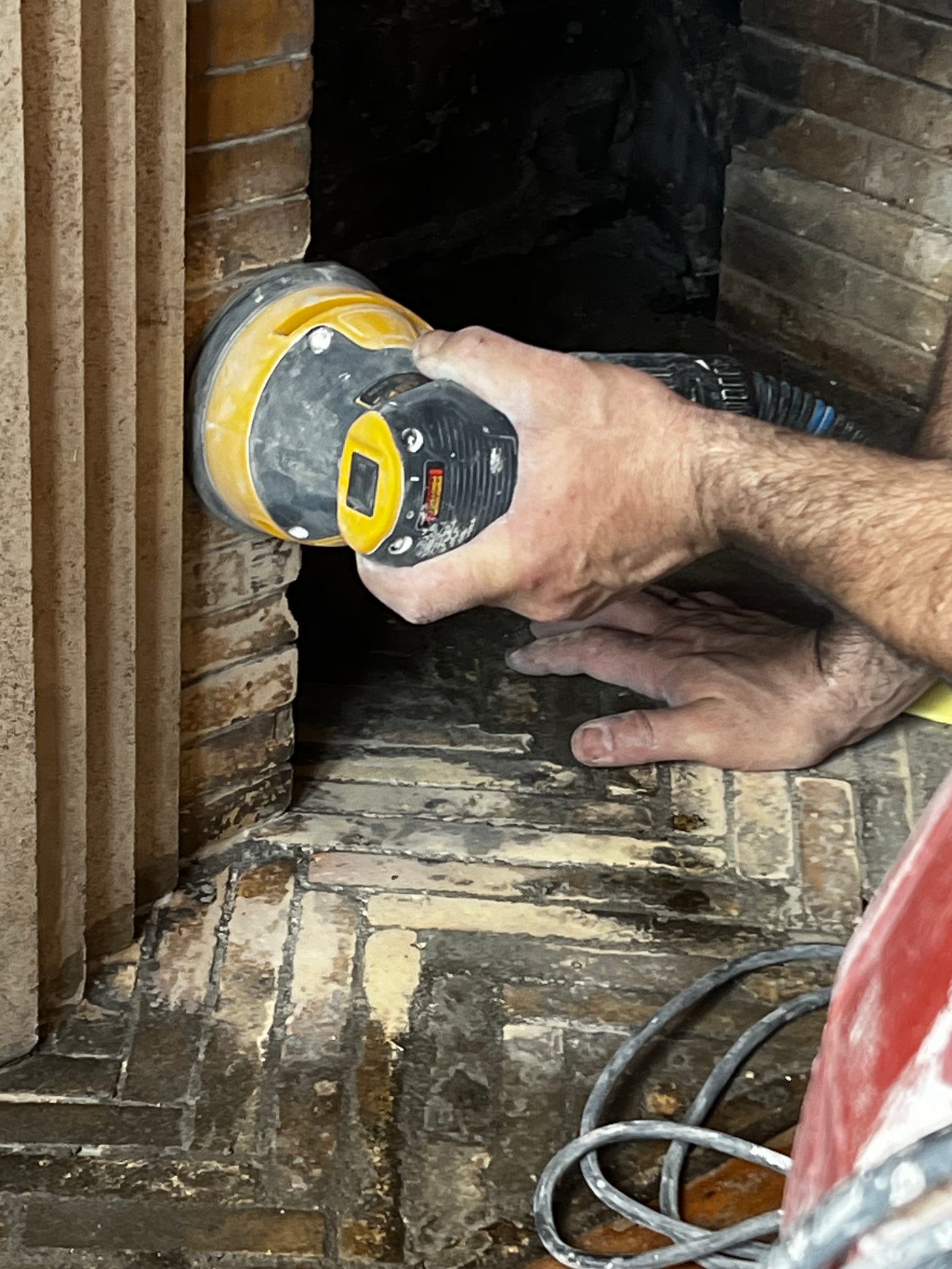Monday dawned and Ricky reappeared with a sander for my fireplaces. He is intent on restoring them to their former natural-colored glory. He thinks we won’t even need to paint them when he is finished but I am not so sure. We will know in about a week if he can truly remove the old grime and layers of paint necessary to coax the original color to come through.