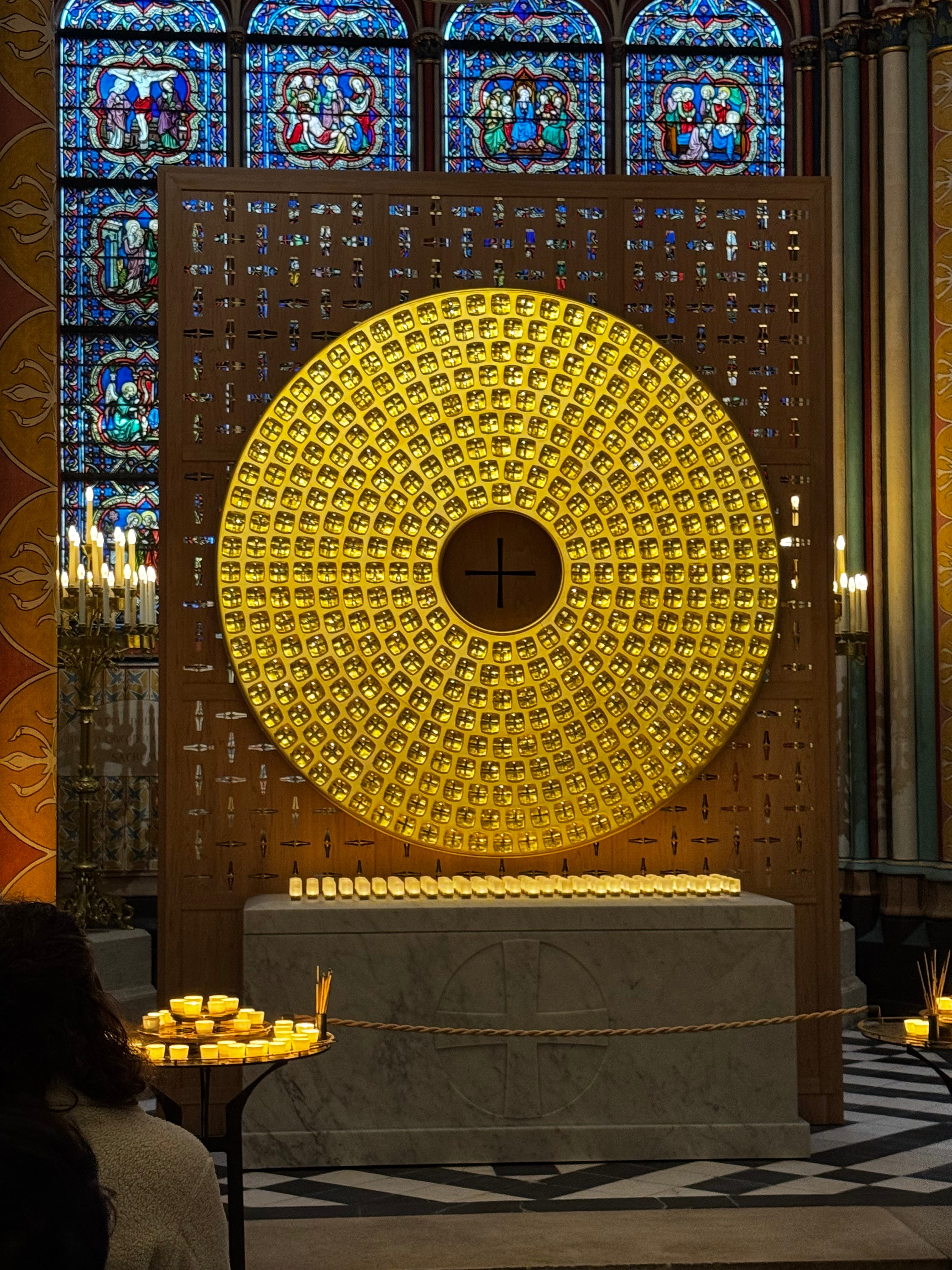 The coolest thing though, was behind the altar at the back of the nave, there is a giant gold-lit circle with a little oculus in the middle, in which will be suspended the Crown of Thorns, purported to be worn by Jesus upon his death. It was a riveting presentation, more along the lines of a modern art installation piece, and will really draw attention to this ancient artifact. Previously, I believe it was just behind some dusty glass in a case, but honestly, I really don’t even remember where it was housed. Now, it is majestically illuminated for all to enjoy