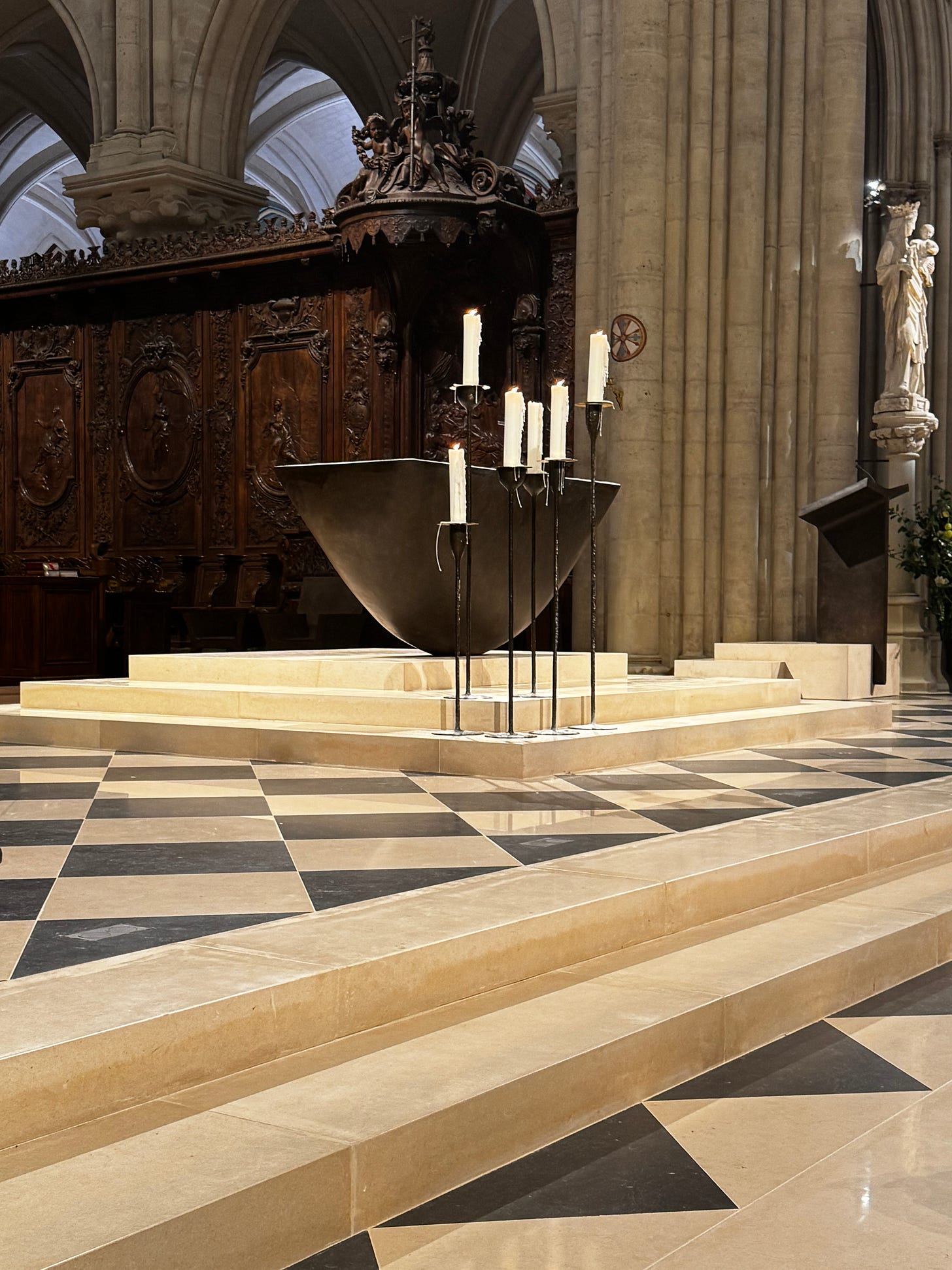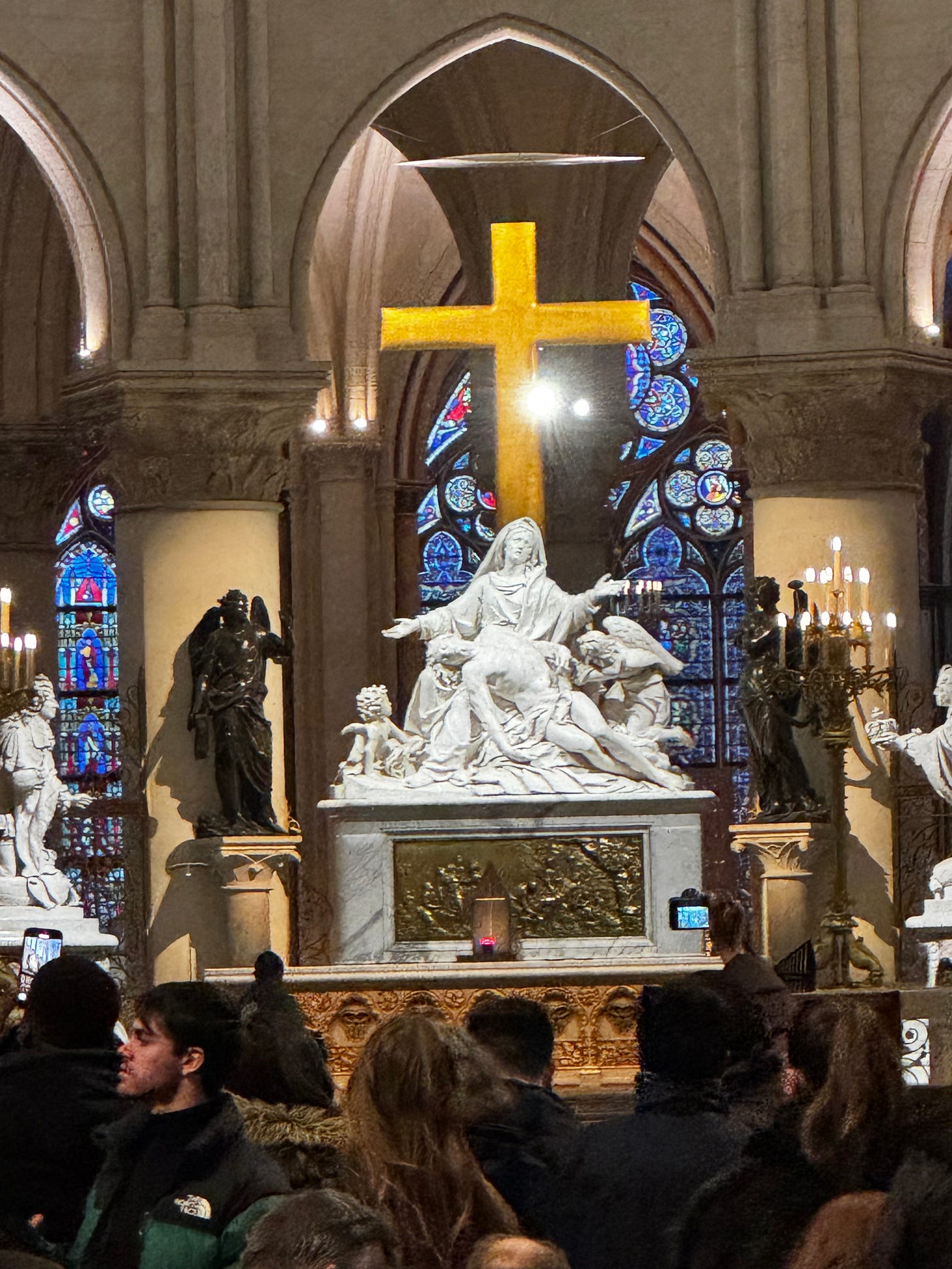 The chapels on the sides of the body of the church have also all been redone and the statuary and paintings are greatly refreshed. The whole of it was something so different from what it was before that my head was on a swivel and I could barely take it all in. One standout item, that seemed particularly strange and out of place, was a round sales desk with all kinds of items for purchase—from books on Notre Dame to rosaries and candles and other religious paraphernalia. Just like a museum bookshop but right in the middle of the church. A little commercial, but I guess they gotta pay for this restoration somehow.