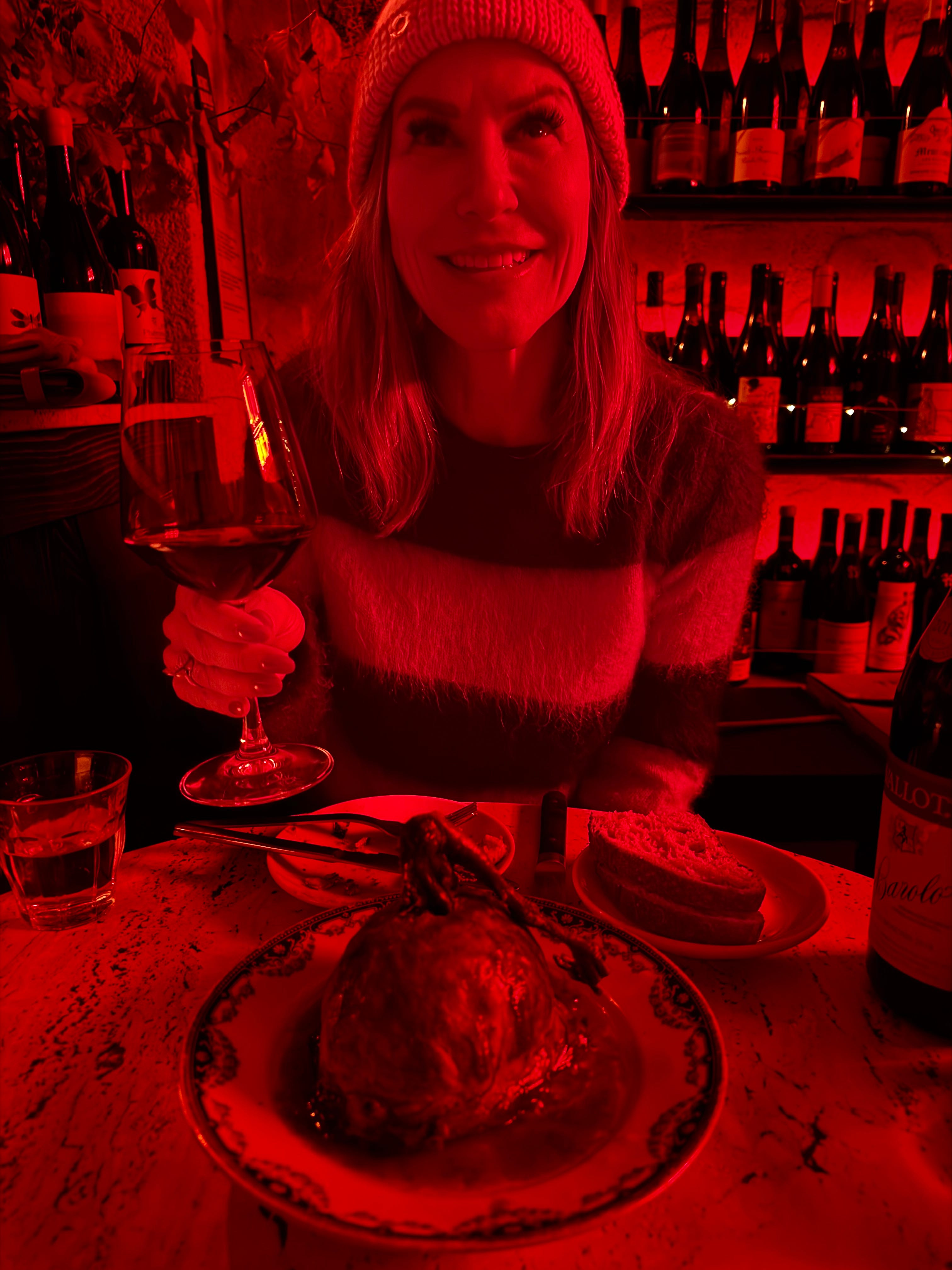 A yummy winter Pithivier—pigeon pie. The photo is so red because we were sitting under the neon sign. Photography — not my strong suit.
