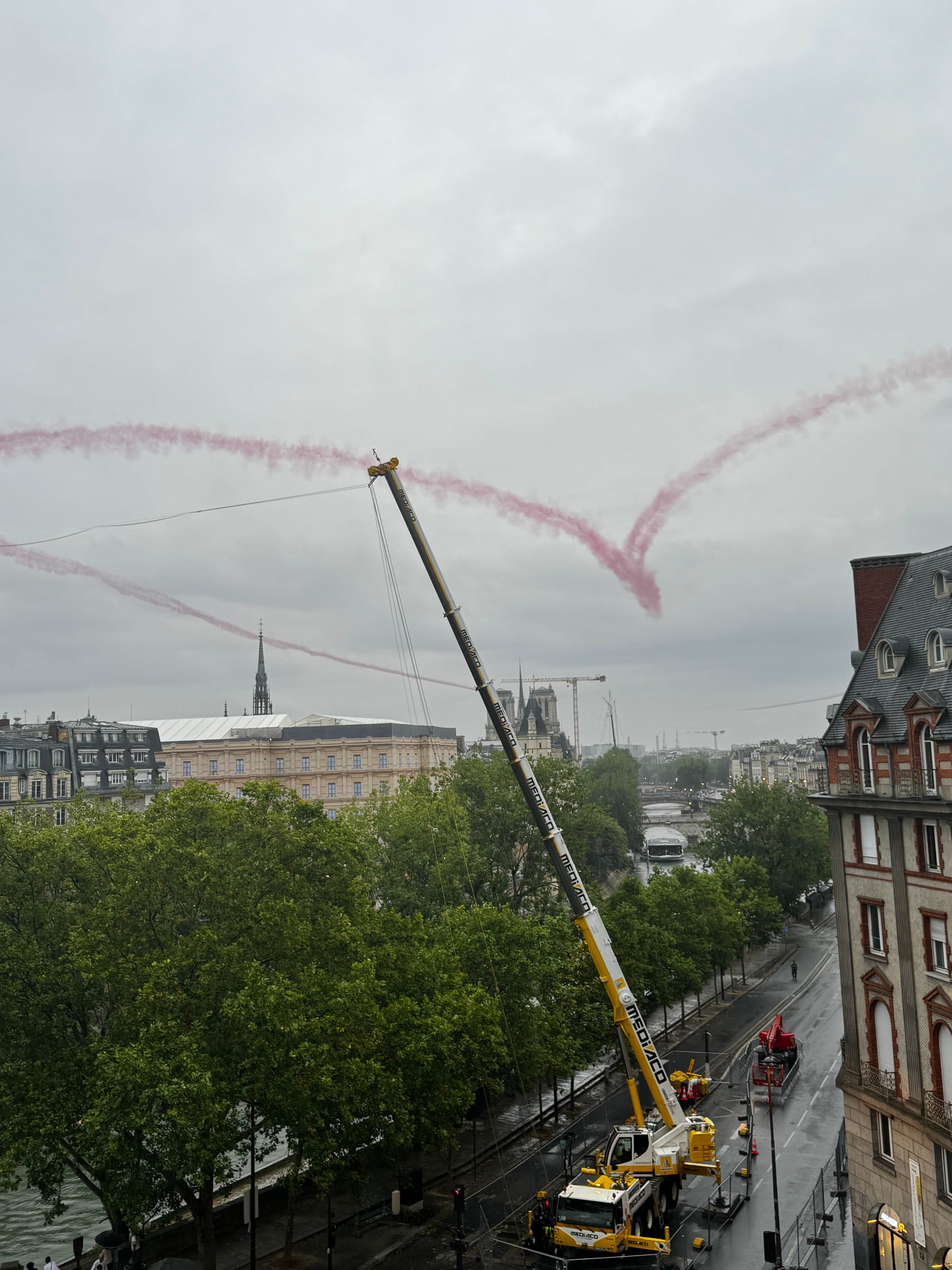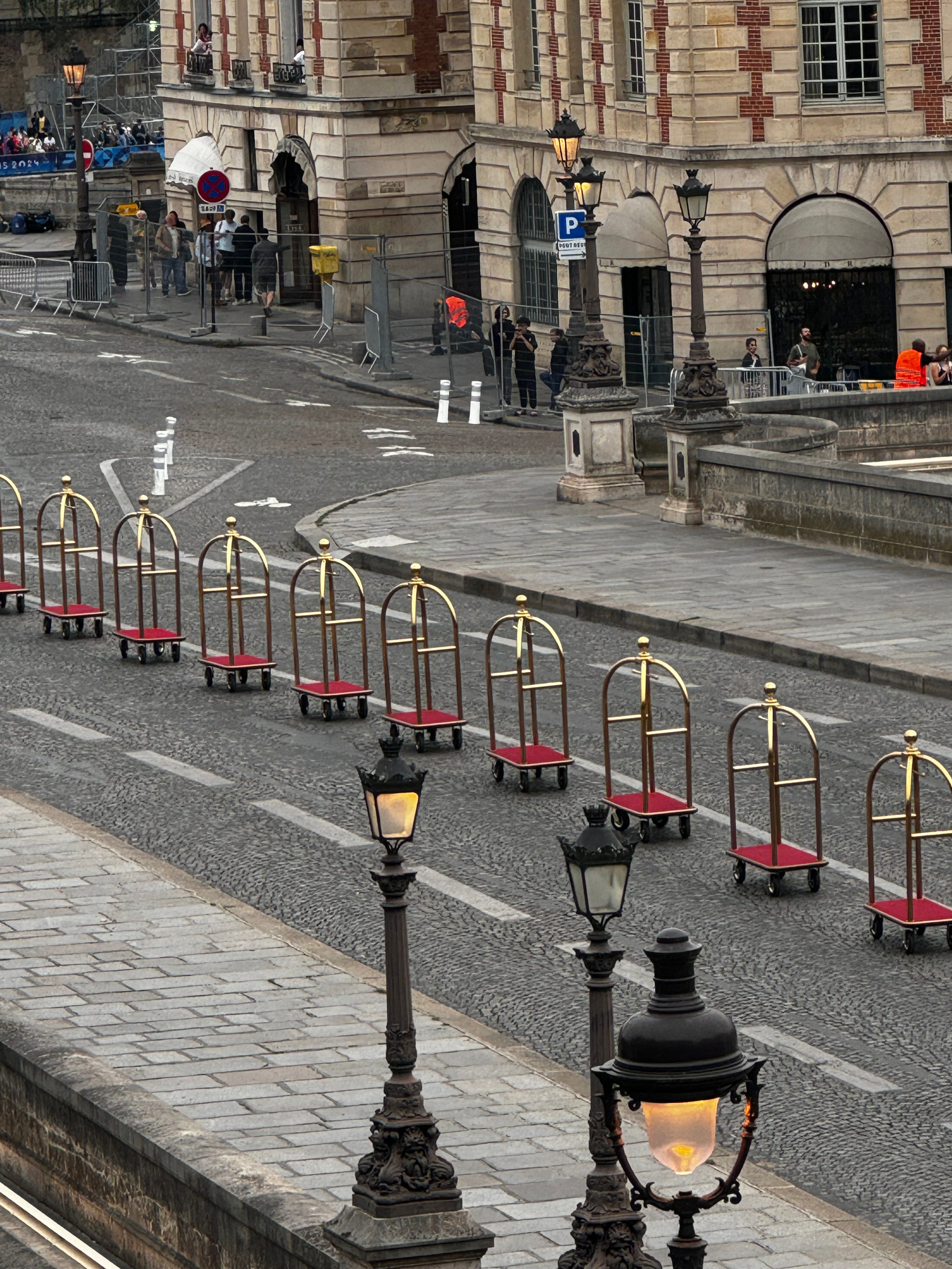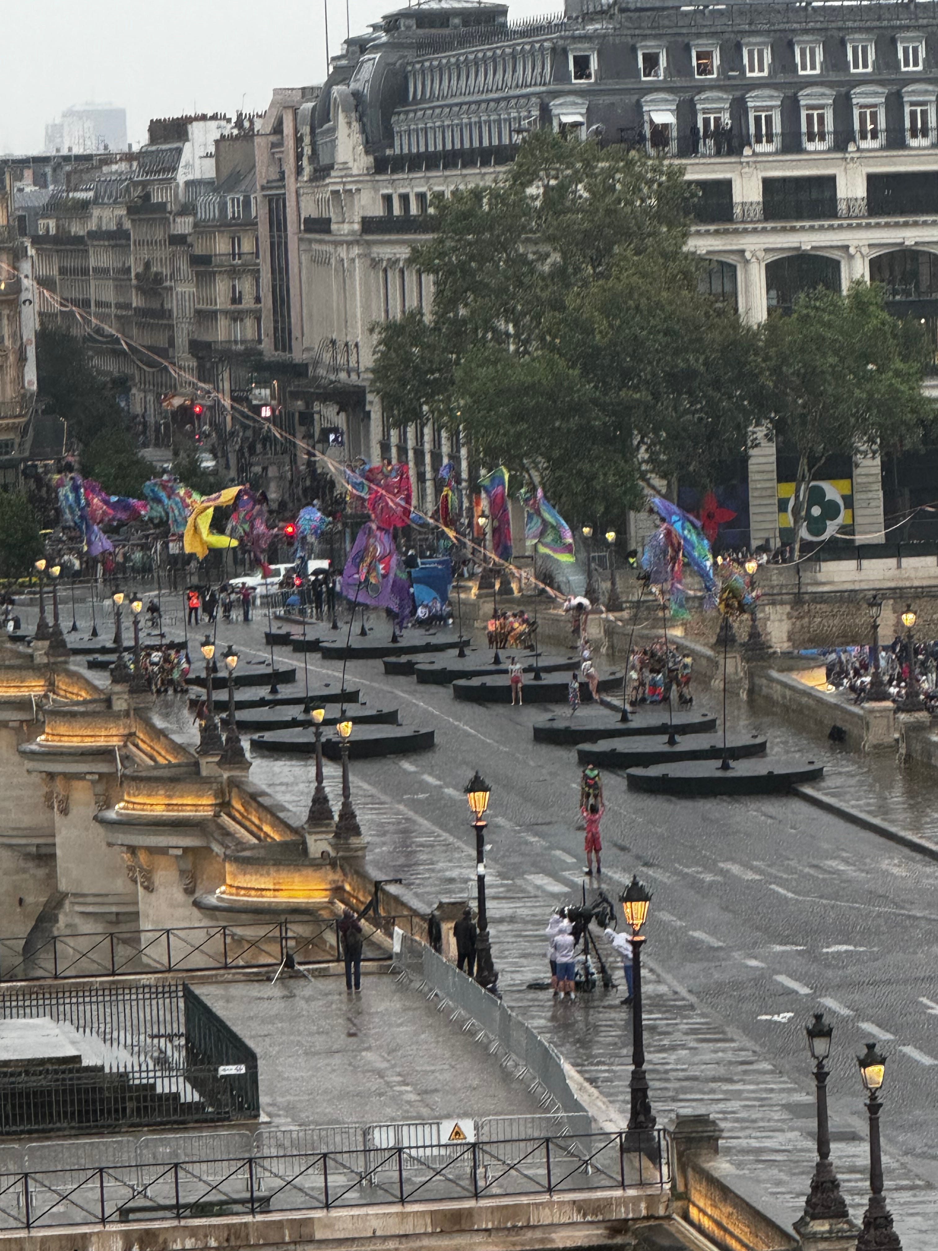 I have to say the opening of the Olympics was quite a sight! From our vantage point we saw all the activities on the Pont Neuf which included acrobats, tightrope walkers and dancing bellmen (now we know what the luggage carts were for) but we honestly had no idea of all the other “scenes” that were playing out all down the river. I would have loved to have seen Lady Gaga or the woman who sang La Marseillaise from the top of the Grand Palais. The flotilla of athletes coming up the Seine, which I am sure you all have seen, required one to stake out a place from which to watch- and because events were happening all over town -there was no way to witness it all!! Sadly, I saw more on You Tube the following day than I did that night. Which is not to say we did not have fun-we did! There was non-stop action on the Pont Neuf!