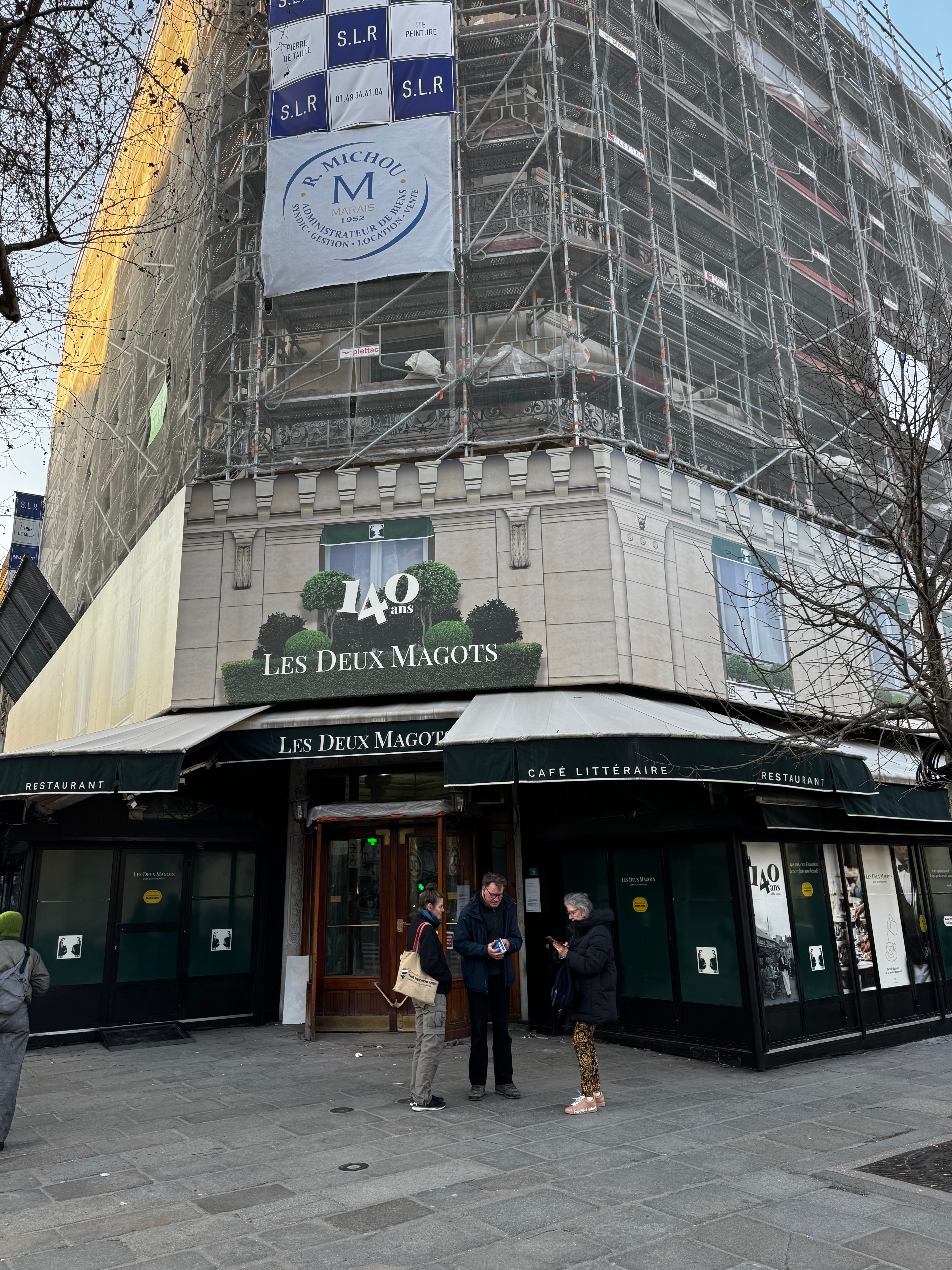 After lunching at Dior, I am now unexpectedly in Paris and could not be more thrilled! I wasn’t sure it was going to work out, so that makes it even more special to be here. My daughter is on break from university and we are spending some mother-daughter time together. As soon as I arrived and unpacked I headed out for a snack at Les Deux Magots—touristy I know—but I can’t help it—I love it. Well, lo and behold, upon my approach, I saw the scaffolding and the fenced in outer area where the newish part of the cafe has been torn down. The entire place was closed! There is a wrap around sign on the exterior that says 140 years—so I am guessing it is not closed for good but instead, receiving a long overdue facelift. I hope they don’t modernize it too much —I kind of liked it the way it was.