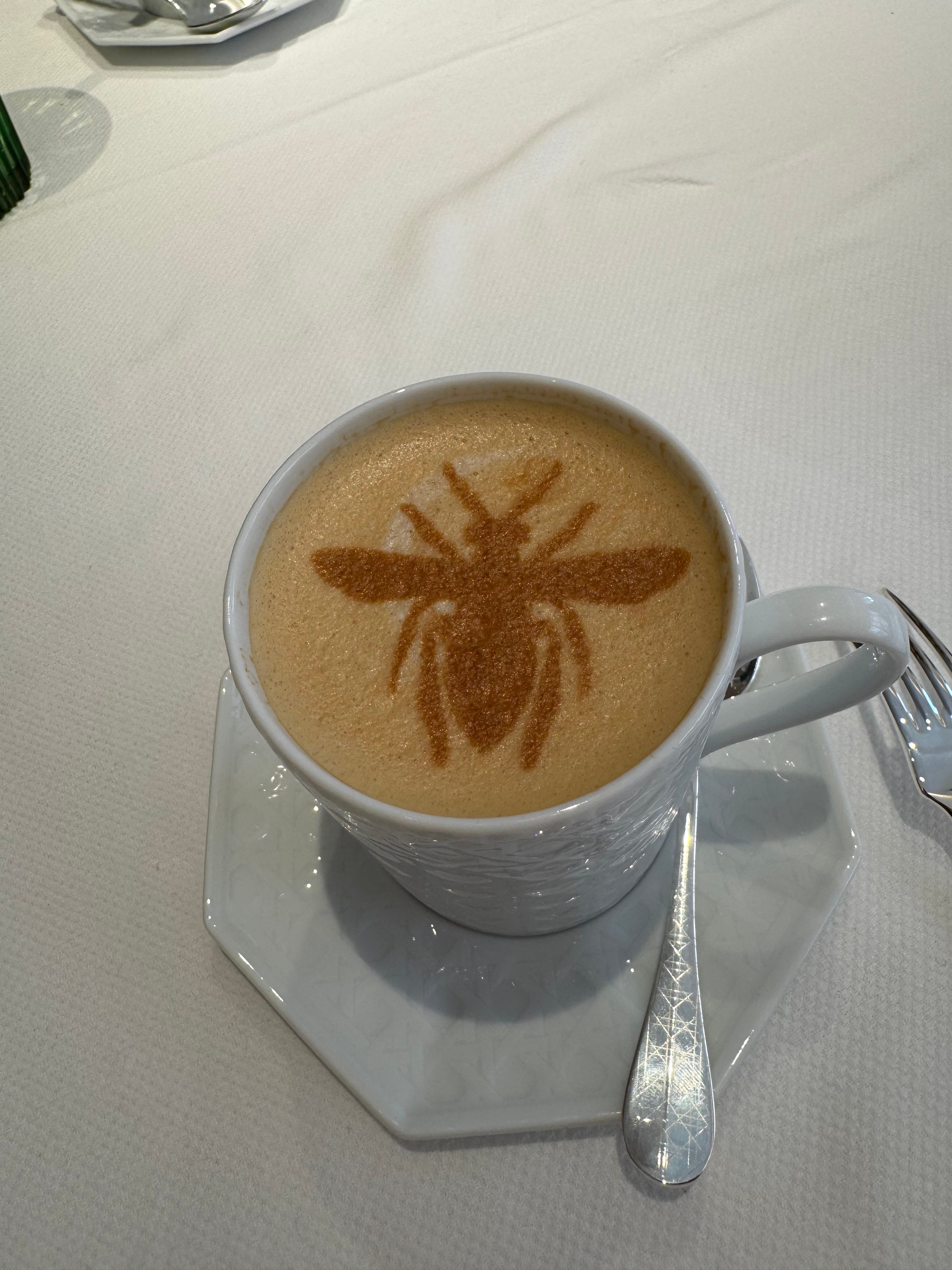 The answer is the newly opened Dior Cafe in Highland Park Village. It is elegant and so, so French! It is decorated in a modern, but très chic and comfortable way that allows one to absolutely believe that she was somehow transported directly to Paris for lunch. Upon entry to the Dior store, you climb the staircase to the second floor and are immediately welcomed by smiling young women who eagerly show you to a perfectly set table. The decor is not so fancy, but it makes you feel special and coddled — for example, beside each table is a little poof in the same fabric as the chairs, whose sole purpose is to gently receive and nestle your little handbag. I love that thoughtfulness. Another kind touch was the immediate offer of champagne upon arrival—now I am not a regular day-drinker, but still—so festive and welcoming! The day I was there I also got to meet the executive chef and creator of the menu—three-star Michelin Chef Dominique Crenn. I totally have a crush on her and am completely starstruck. As you all know, food is a passion of mine and to meet this amazing chef who has created so many unbelievable concepts was just thrilling to me! The food was delicious and just the right portion size for a yummy lunch that still left room for a coffee and gorgeously delicious dessert.
