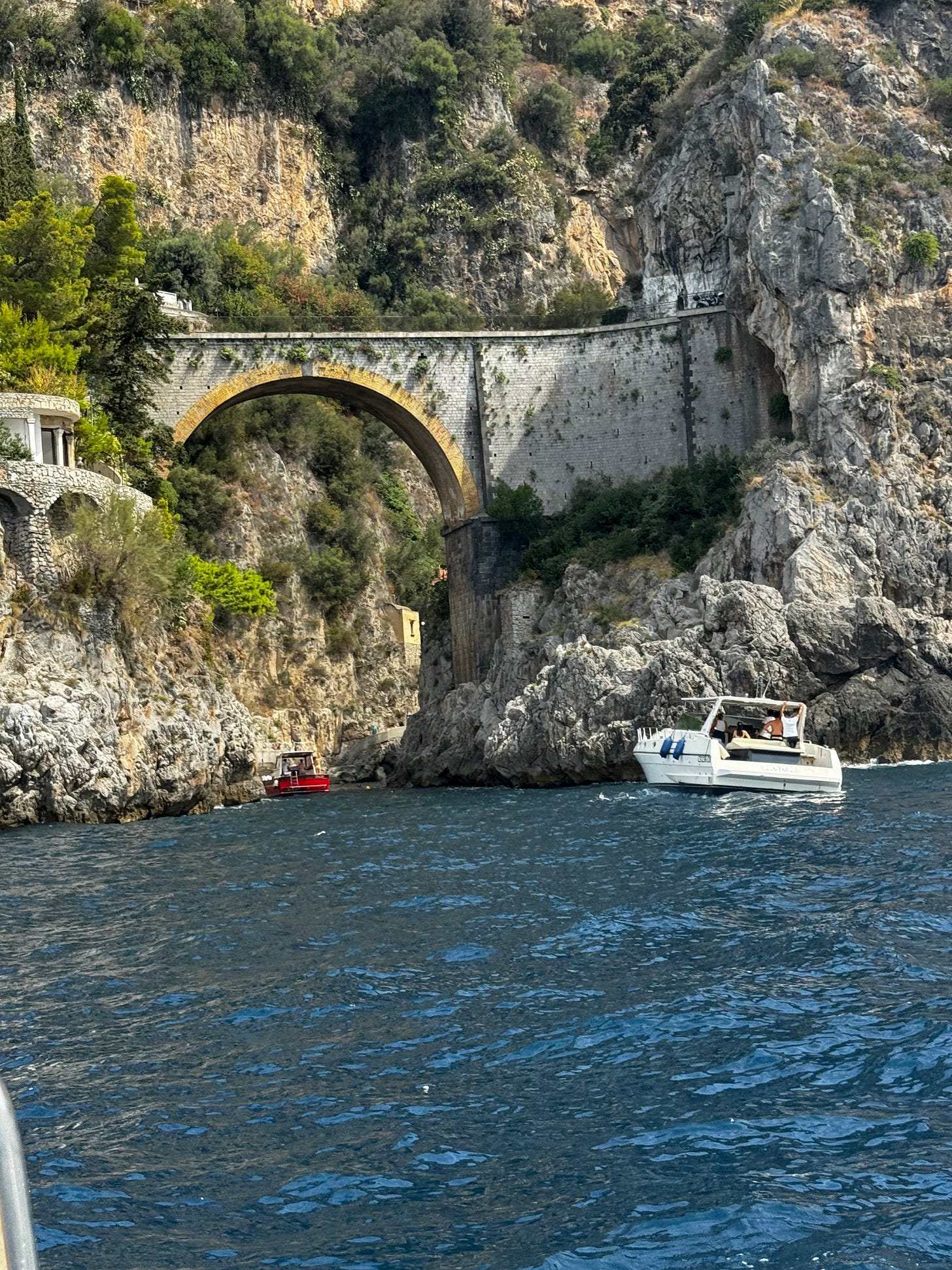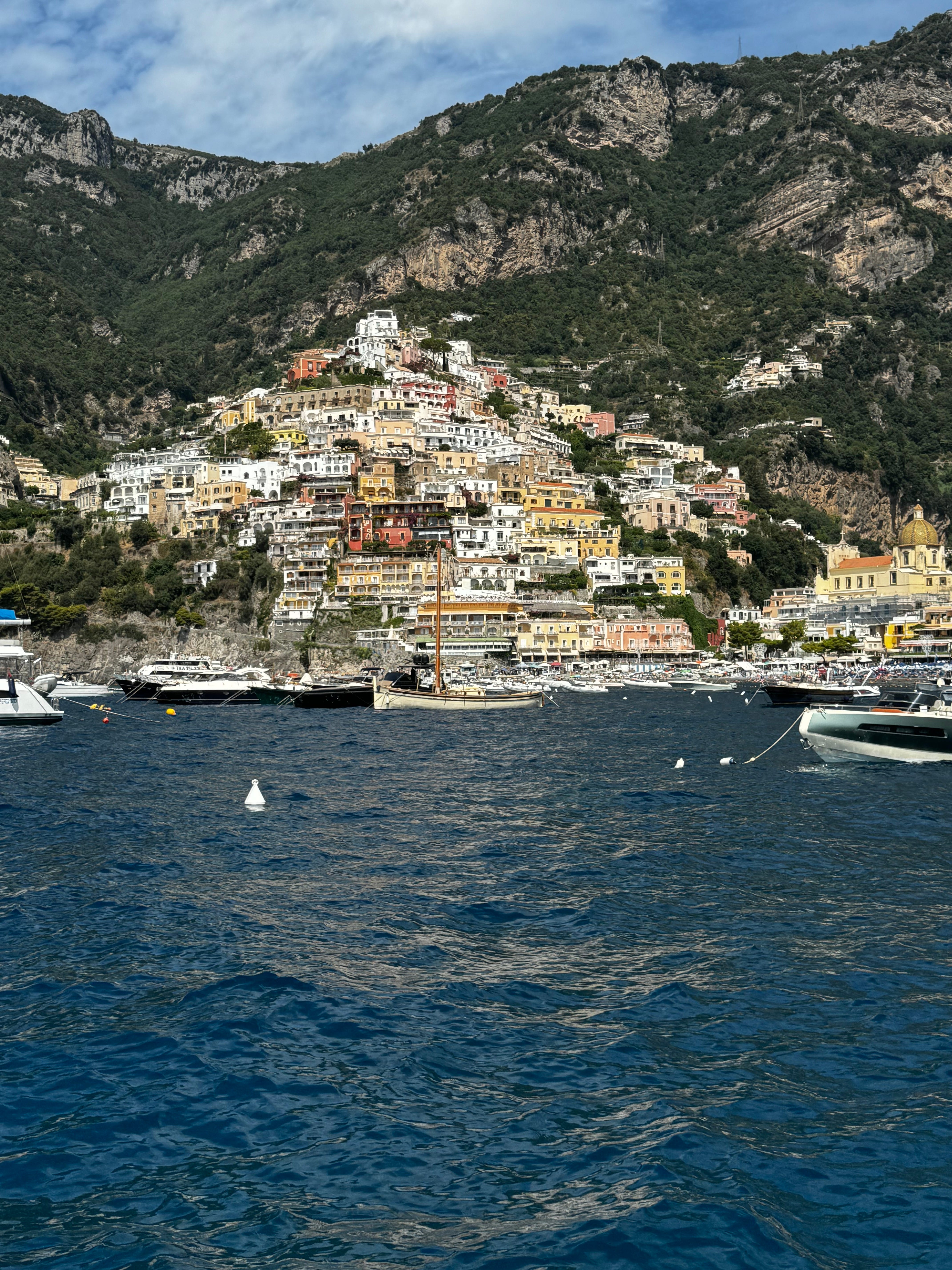 The following day we took the hotel’s complimentary shuttle into Amalfi-which sits at sea level below Ravello—it is not that far —maybe a mile or two but takes thirty minutes by car because of the one-lane, winding mountain road. It was very lively and busy and right on the water. We saw several beach clubs with umbrellas set up- south of France style— in long rows, but we did not explore as we immediately boarded a boat bound for Positano. We cruised down the Mediterranean parallel to the coast, ogling all the beautiful hillside homes, picking our favorites for our future dream life on the Amalfi Coast.