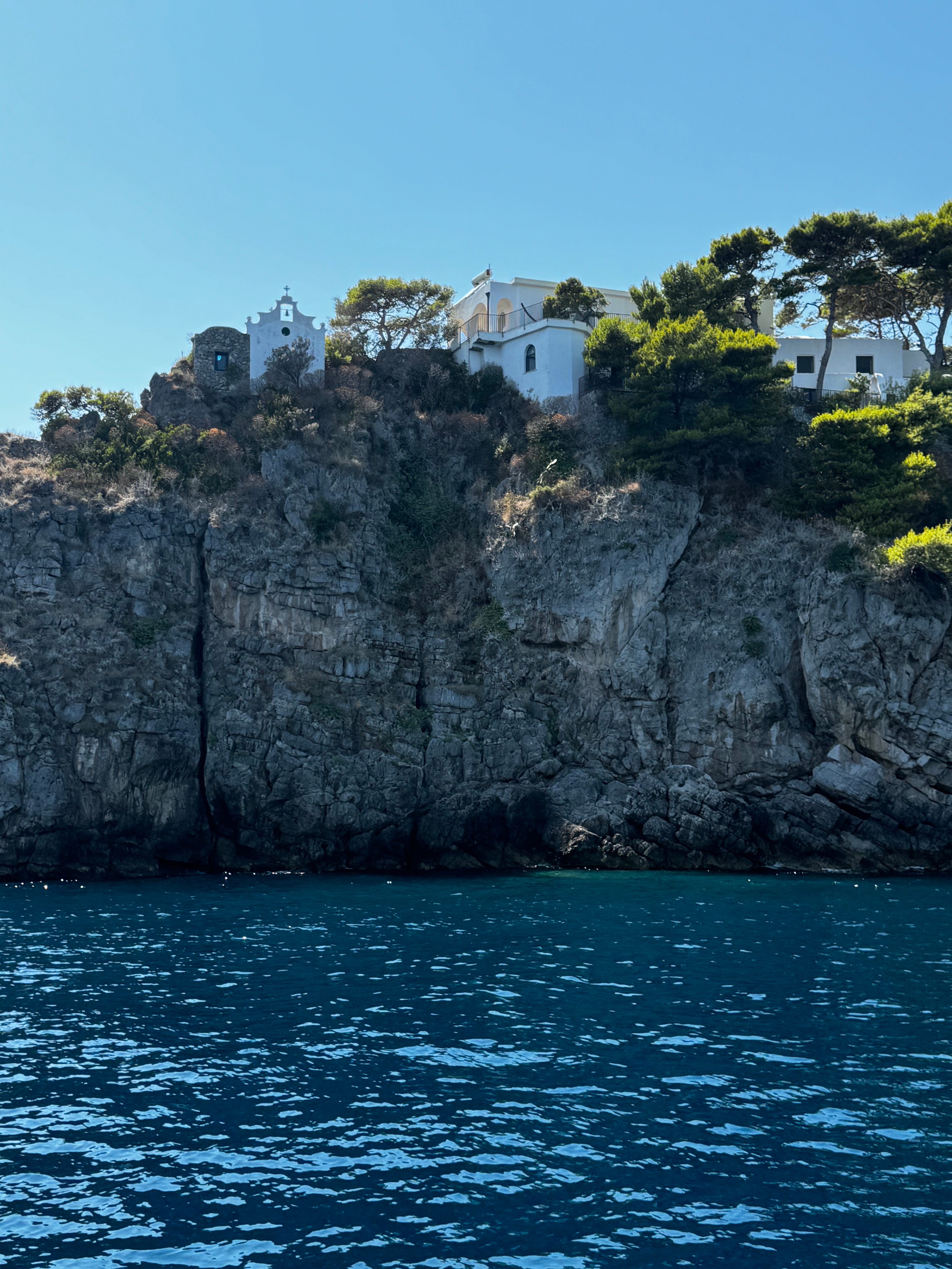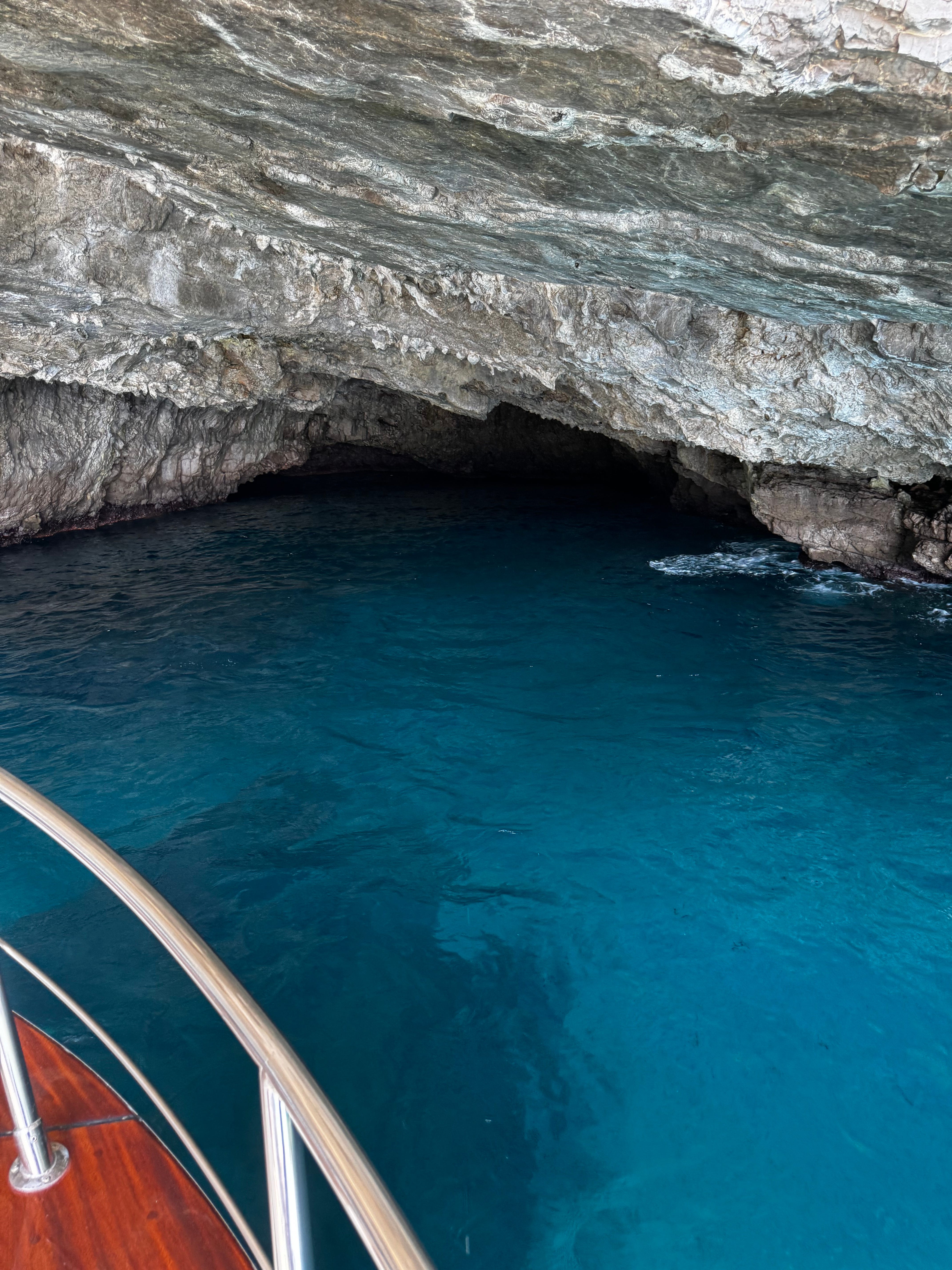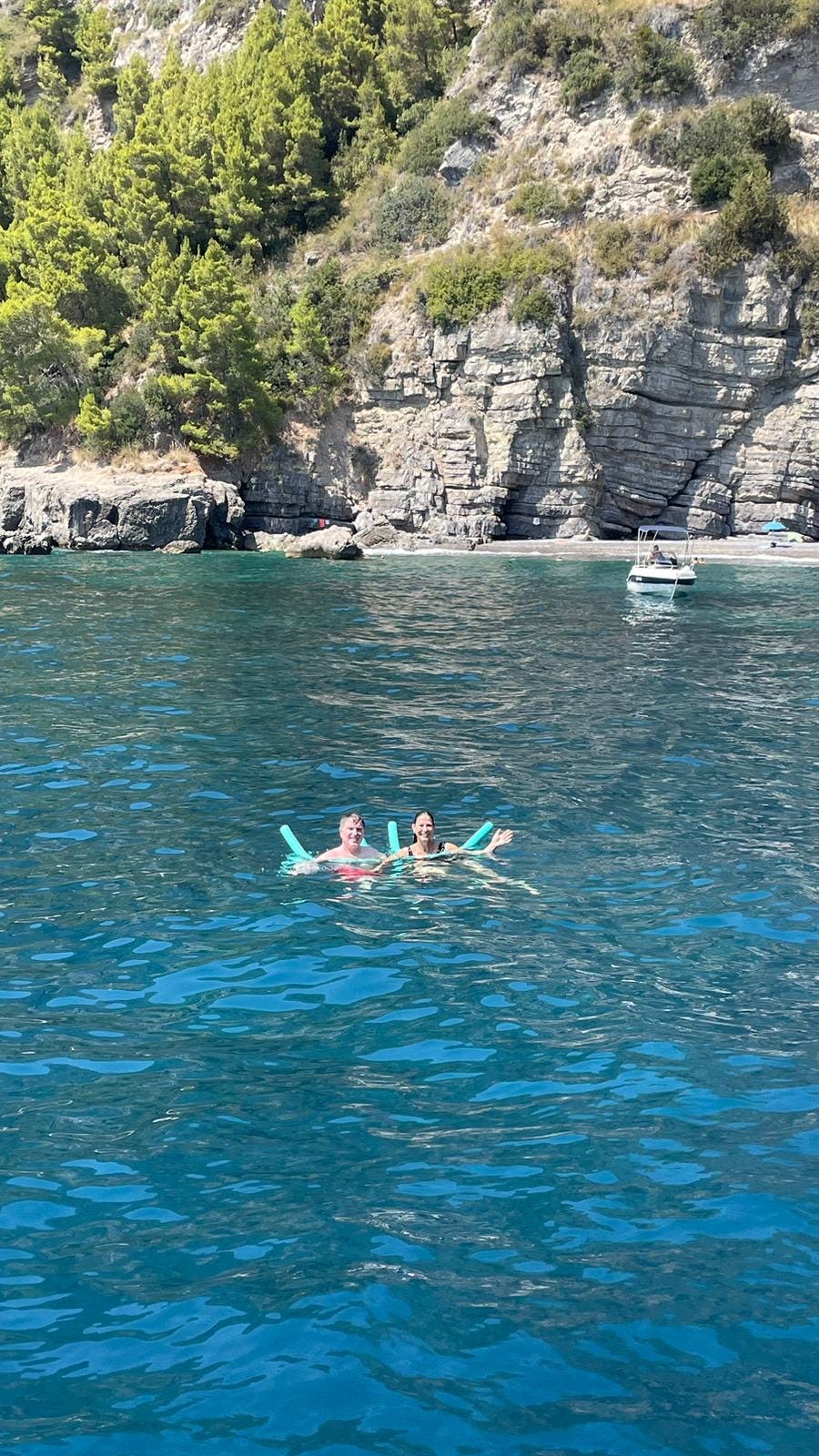 Unfortunately, two thousand other people on the cruise ships moored nearby had the same idea, and the tiny town was clogged with day-trippers everywhere. We tried to do some shopping (which looked fantastic!) and sightseeing, but it was a bit like opening day of the state fair— long lines, throngs of people and generally nowhere to enjoy the beauty of the town. It was also about 95 degrees and we were a hot, sweaty mess in short order. We ducked into a beautiful courtyard of a hotel and ordered a lovely lunch with some properly chilled white wine but Les was already over Positano, so we headed back to the dock and boarded the boat for some cruising of the coastline and a little swimming. Our boat captain was raised in a little town next to Positano and he knew all the good spots. Soon we were swimming in a secluded cove and jumping off the rocks into the blue, blue Mediterranean.