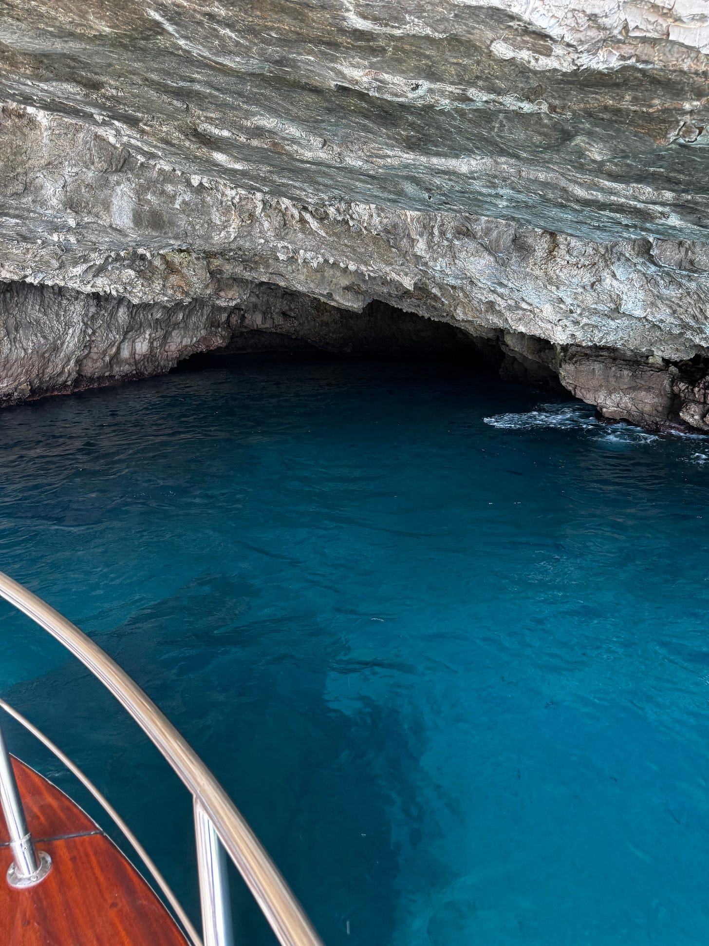 We swam here and there all up and down the coast through the afternoon. The water clear and warm. Our captain took us to see a private island that is available to rent, the only fjord (he claimed) in the Mediterranean and also to a beautiful cave and a an unknown little beach with ruins- so rocky we could barely walk on it.
