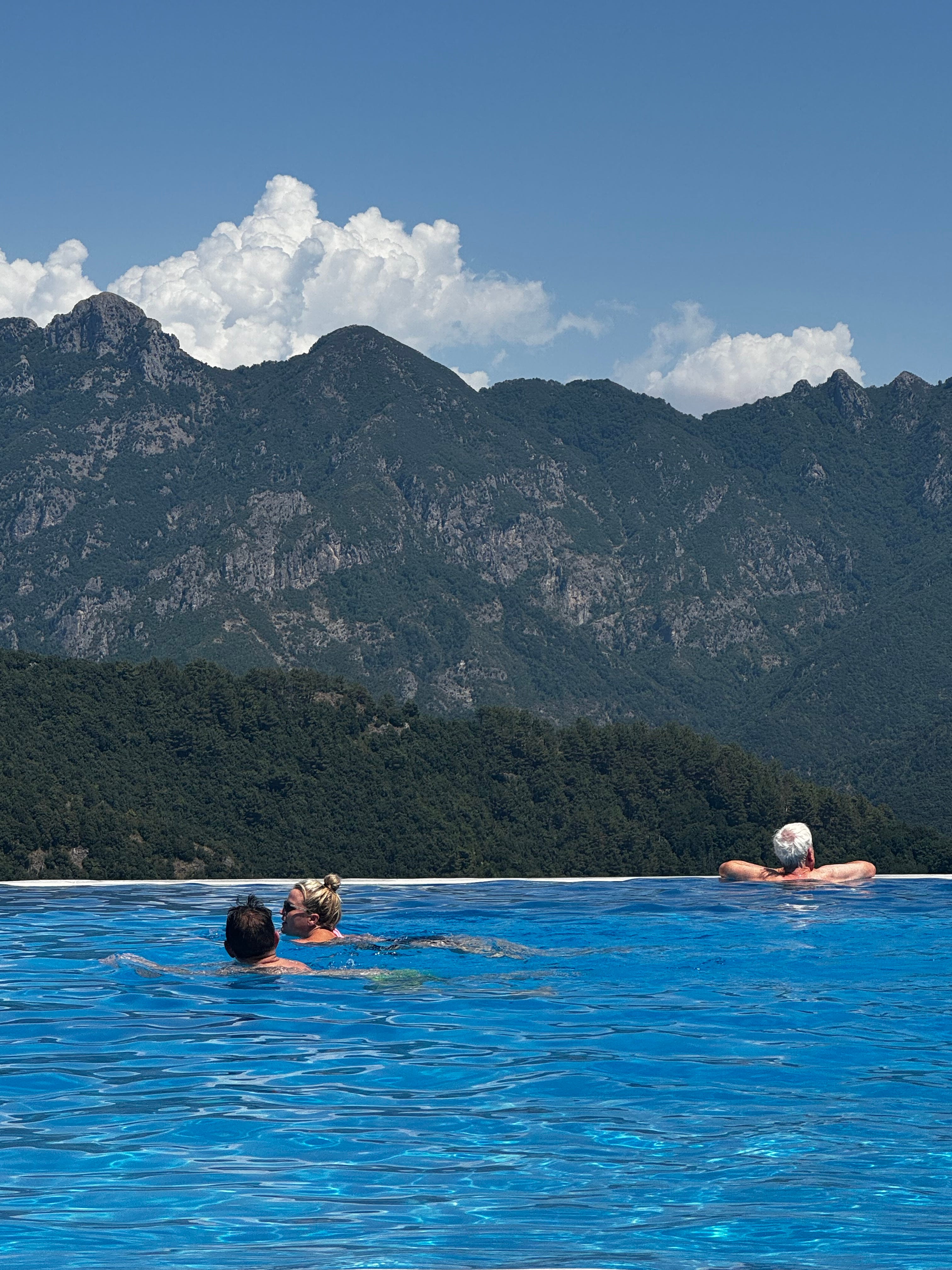 As the sun got warmer and higher in the sky we decided to put on our swimsuits and have lunch by the pool at the hotel. And what a pool it was! The infinity edge pool looks straight out at the mountains and the sea. The pool was not only gorgeous but the waitstaff were fantastic and it was not a mob scene or really any scene at all. It was all very low-key glam. Nobody holding court, no tacky displays of excess, no dancing on tables-just people-couples almost exclusively, engaged in conversation or having lunch- no pretensions at all.