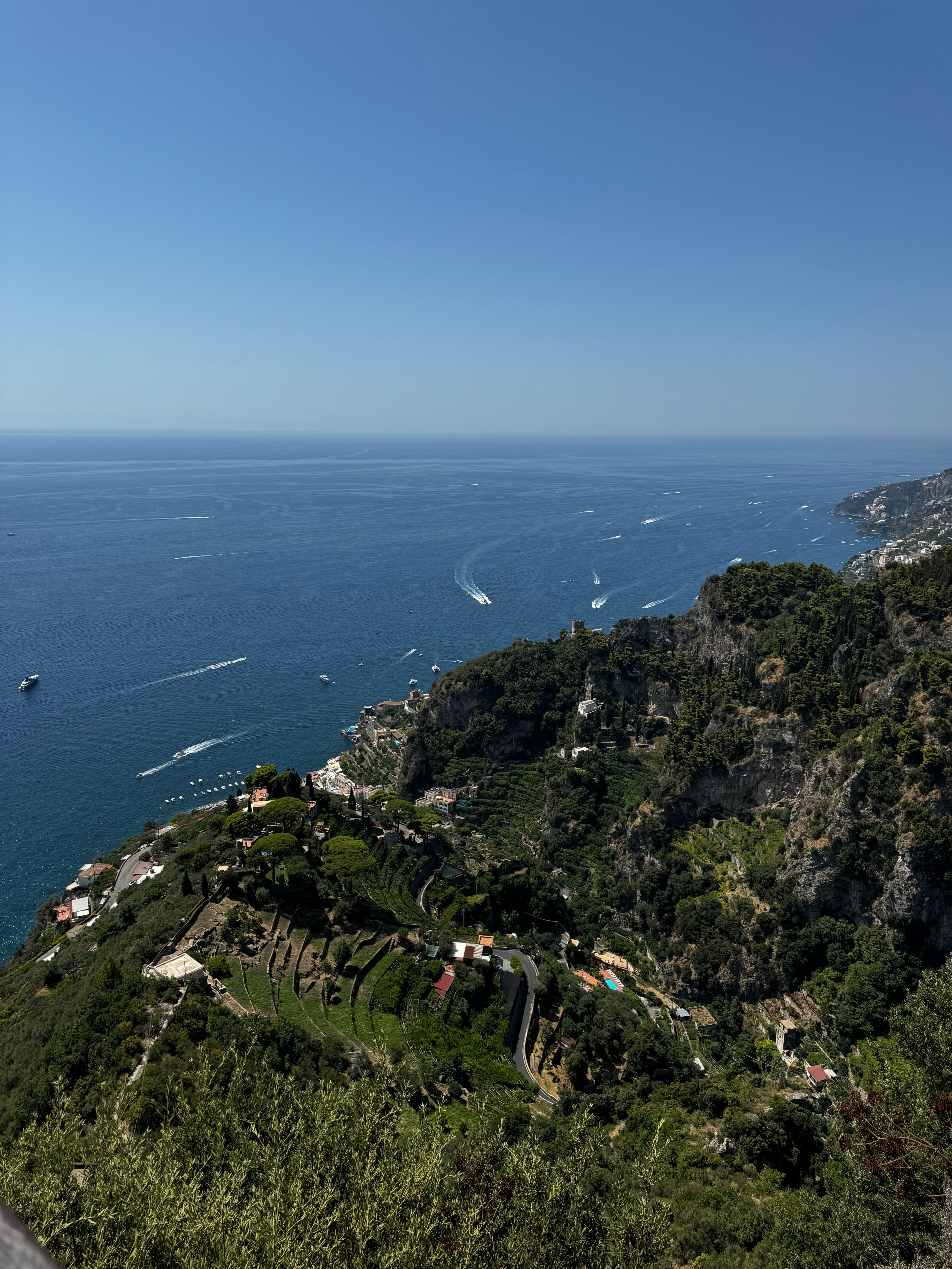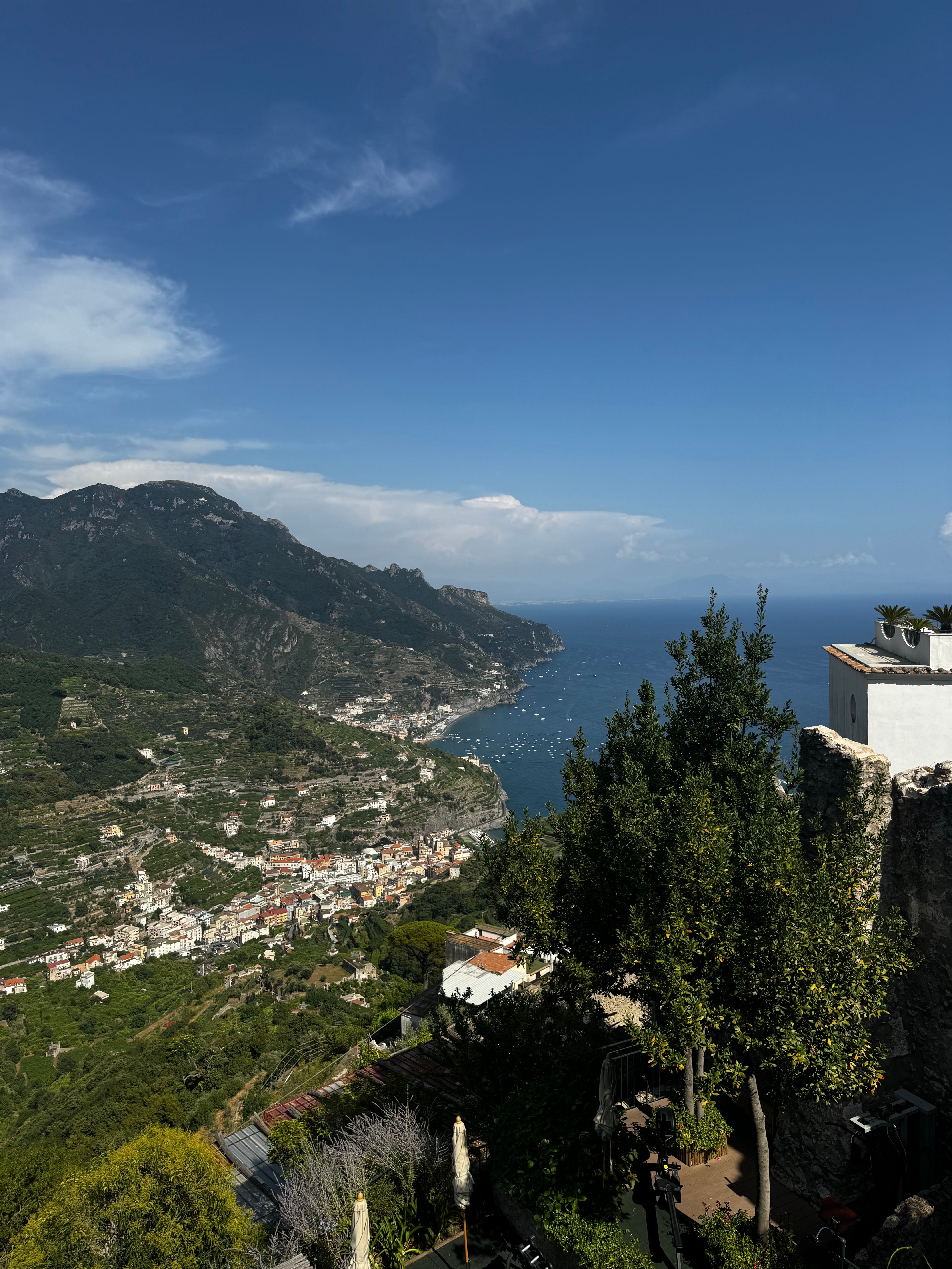 Ravello may be one perfect spot here on earth. If you don’t believe in God -go there, you might change your mind. It is not glitzy or super fashion-y —the scenery is the star. Dramatic mountains, deep blue Tyrrhenian Sea, small boats scudding across the blue below, while white clouds float across the blue above. Lemon trees everywhere. Jacaranda, hibiscus and wisteria hanging over pergolas, half- walls and garden gates. The hillsides trellised with grape vines and olive trees. Same as it has been since Roman times. Only the cars and modern clothing give it away.
