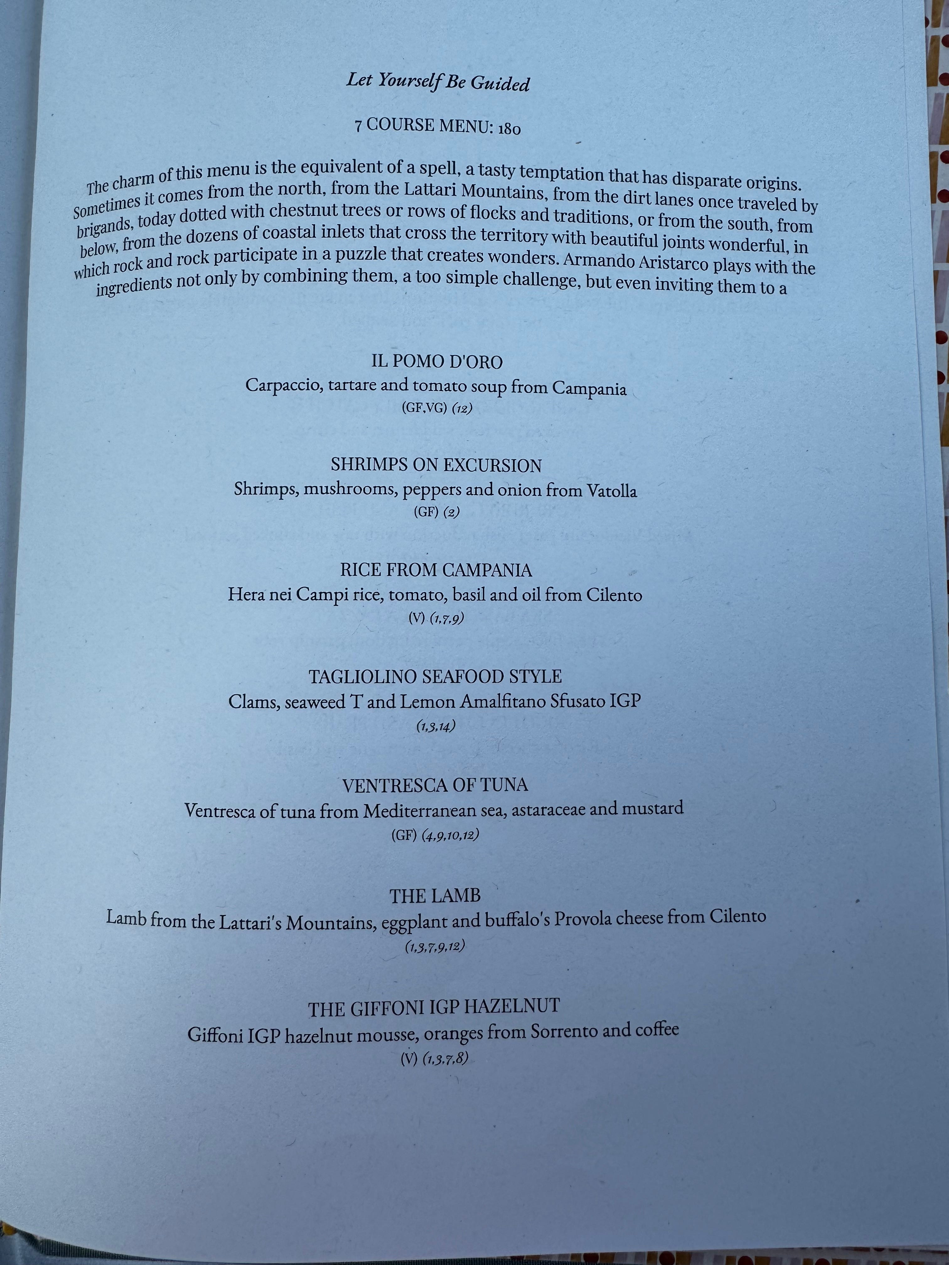 After lounging around the pool most of the afternoon, we knew a good meal was in the cards. The hotel’s fancier restaurant welcomed us that evening, and the meal was one of the best I have had in Italy. There were several set tasting menus and we eventually settled on the “earth” menu (read classic) which was very Italian! Locally grown tomatoes from nearby Mt Vesuvius, homemade pasta, eggplant grown in their garden and a beef ragu-all perfect. We paired all of that Italian deliciousness with a yummy Brunello made with sangiovese -something I don’t usually drink, and I was very impressed. The “Let Yourself Be Guided” 7 course menu was intriguing as well, and we made a mental note to have it another night-especially after seeing the second item-"shrimps on excursion.” We decided that suited us -a couple of shrimps on excursion, and what a lovely excursion!