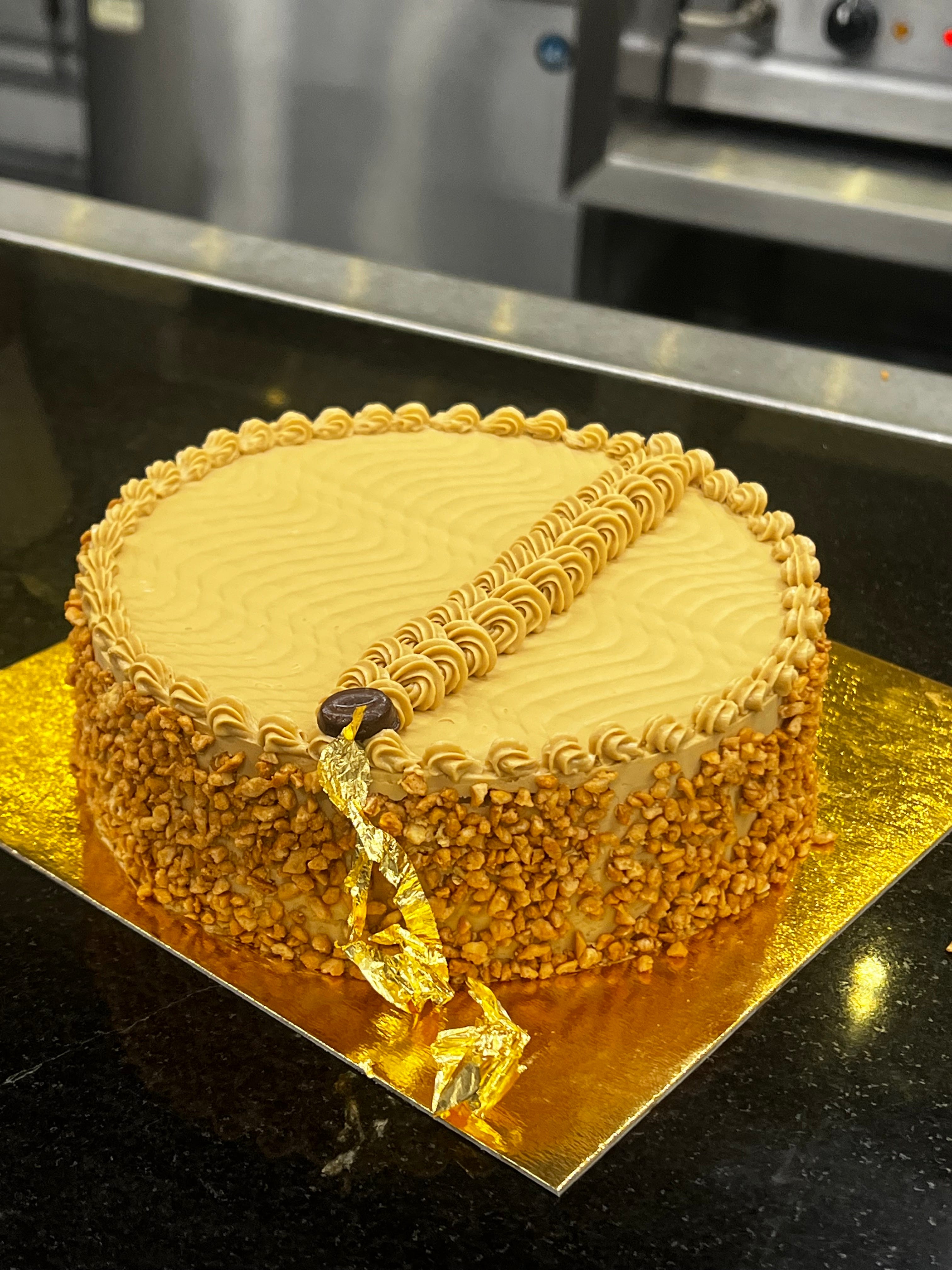 Today, we were on deck at 7am to make the mocha cake from the demonstration yesterday. I had studied my notes and it seemed so simple. It was another sponge cake, baked in a ring and then cut horizontally to make a layer cake with coffee-infused buttercream between the layers, and a piped design on top. I shook off the bad vibes and low grades from the day before, and I was ready to slay!