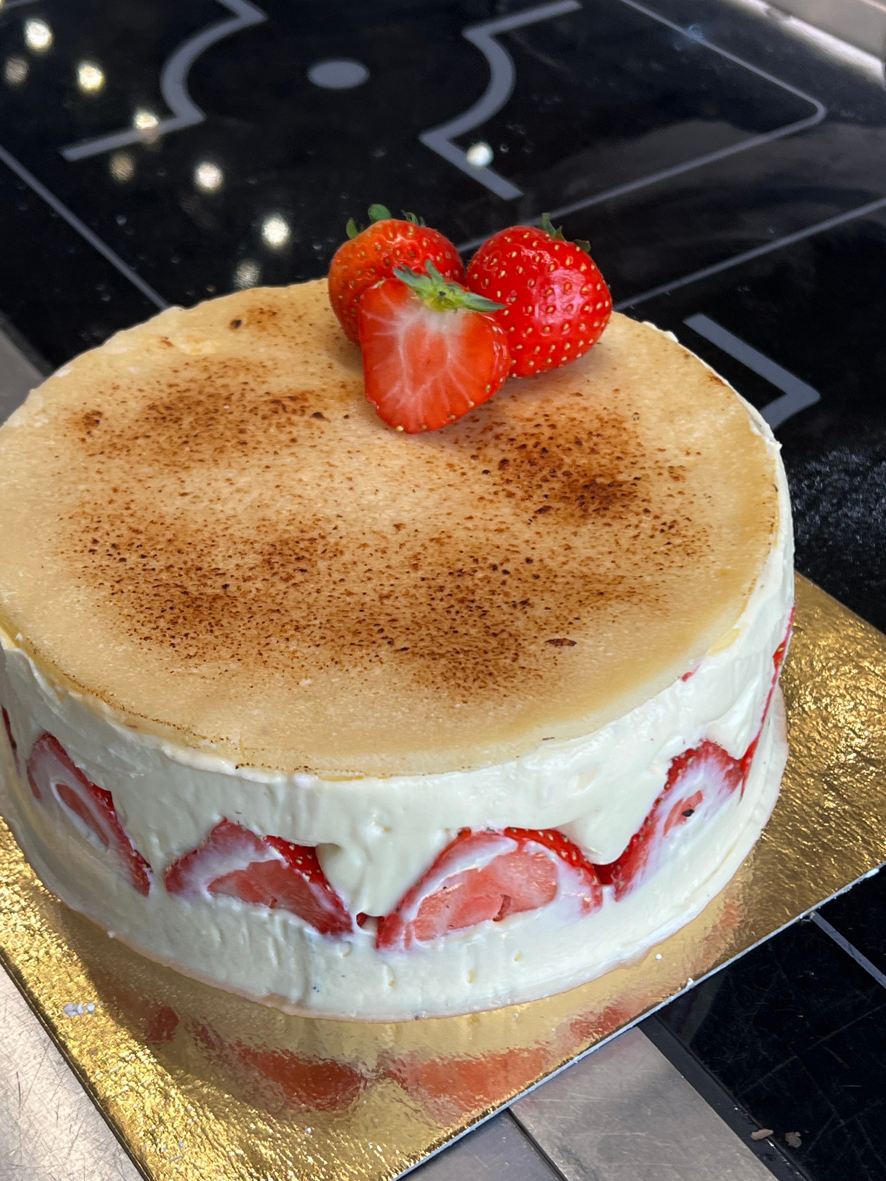 Wednesday we made a fraisier. I was kind of excited, as we have not made a lot of things with strawberries, which I adore. My excitement was short-lived. This particular type of dessert, the sponge of which I write, is baked in a ring and then cut into levels— a layer cake—with pastry cream and fresh fruit in between. The preparation and cooking of it was simple enough—it was the assembly of the final product that got me. I prepared the cake batter, no problem. Poured it in the ring and baked it. Meanwhile I prepared my pastry cream, added a boatload of butter, which made it a mousseline, cut up a basket of strawberries and was ready to be a star. Well, that didn’t happen.